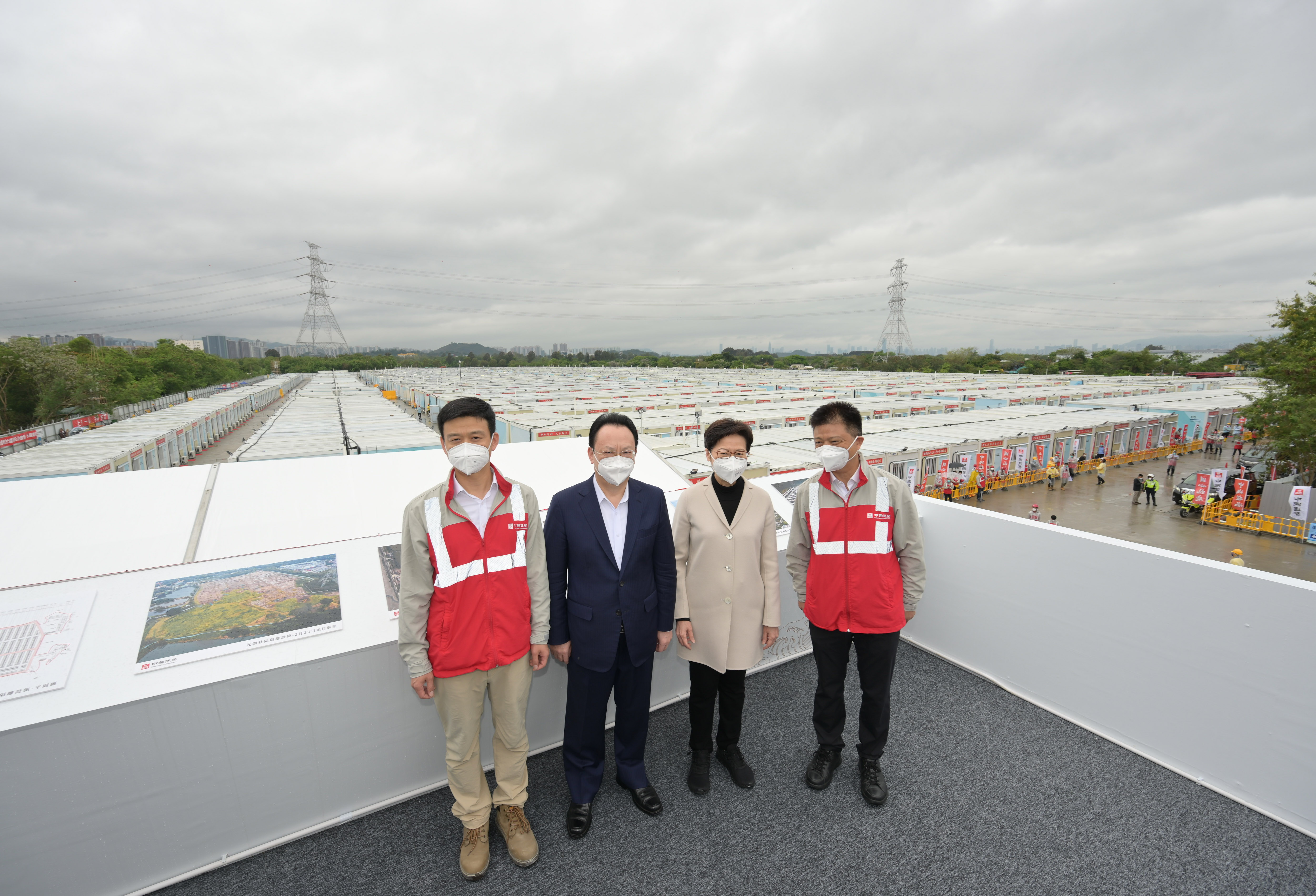 林鄭月娥與中聯辦副主任譚鐵牛及承建商中國建築主席一同視察元朗社區隔離設施,聽取中建集團代表介紹項目規模和特點,以及施工挑戰。