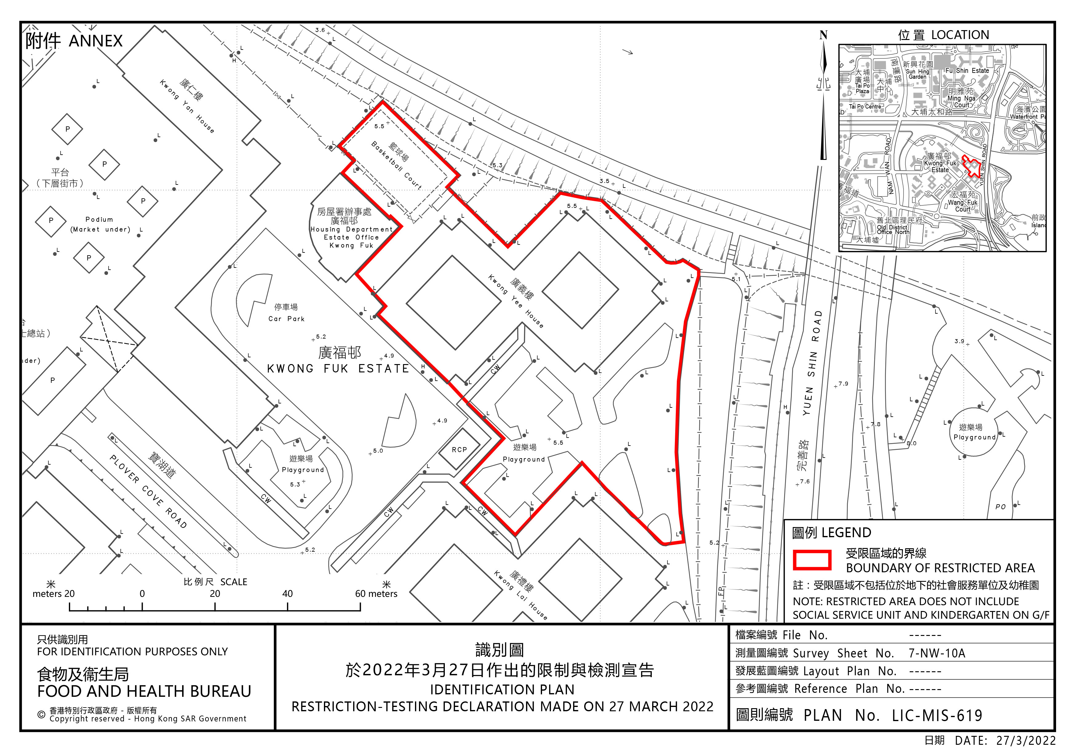 政府今日(3月27日)引用《預防及控制疾病(對若干人士強制檢測)規例》(第599J章),作出限制與檢測宣告,自下午4時起限制在大埔指明「受限區域」,即大埔廣福邨廣義樓內的人士,須留在其處所並接受強制檢測。受檢人士須在其處所等候,直至「受限區域」內所有已識別的受檢人士完成檢測,而相關檢測結果亦已獲大致確定,方可離開其處所。政府目標是在明日(3月28日)約上午11時30分完成此行動,視乎檢測結果,行動或會延長。