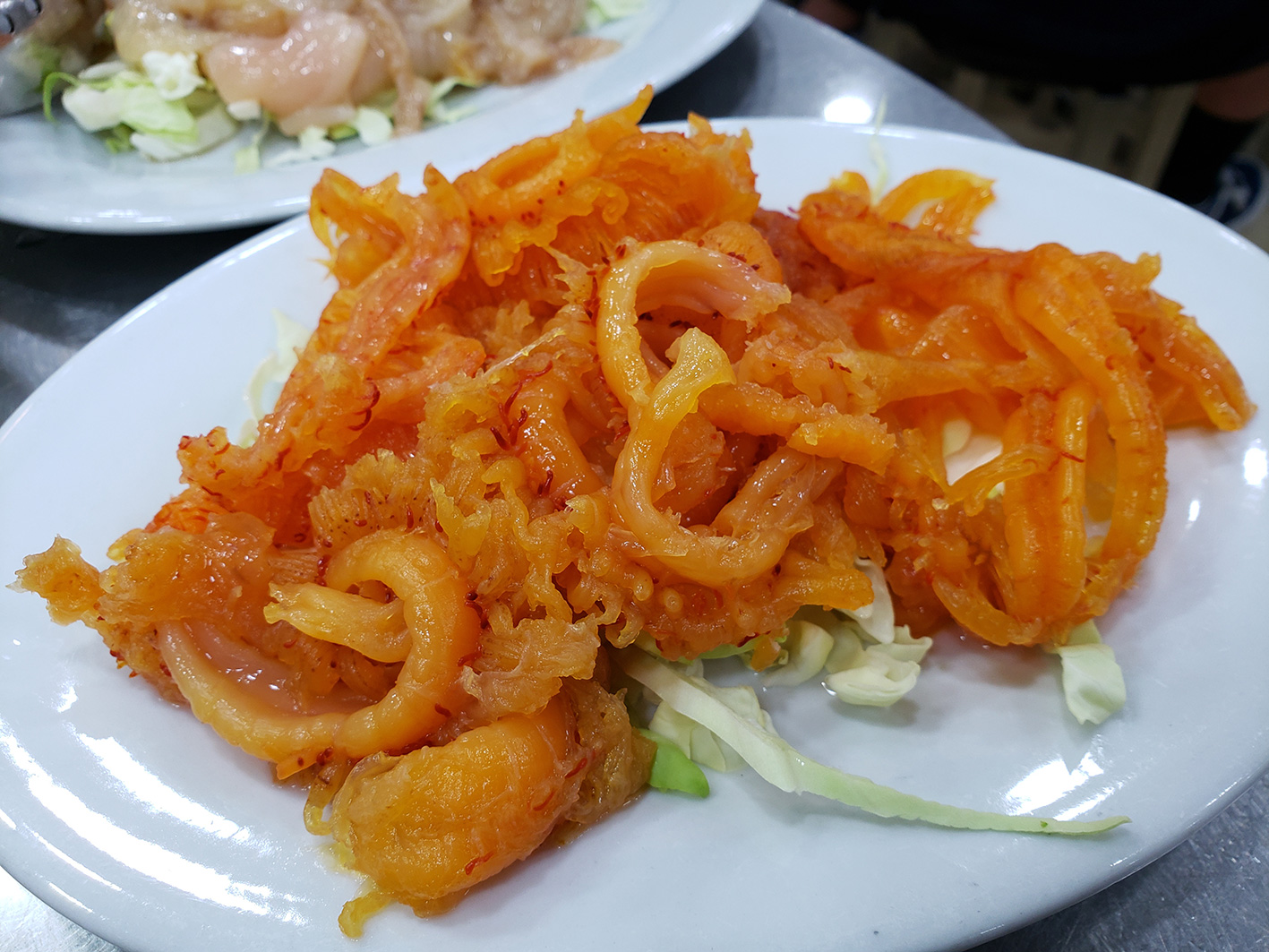同時,店內亦標榜有「游水海鮮」供應,惟見店面魚缸內的海鮮寥寥可數,加上以「時價」定價,故興趣不大。相反,這裡的急凍類海鮮更值得一試,皆因取價公道之餘,份量亦十足。同時,食材解凍也處理得不錯,上桌時大致保持乾爽,不會仍處於僵硬或瀉水狀態;放湯後沒有絲毫雪藏味道,值得一讚。桶蠔經燙煮後,體積未有大幅縮水,入口爽滑,蠔味亦濃厚。桂花蚌鮮甜爽脆,但縮水速度快,建議稍稍一燙,即可進食。而珊瑚蚌(即海參腸)本身的海產味已非常突出,加上非常吸湯,是配合湯底不可或缺的食材。不得不提的是,他們的炸魚皮亦是自家製,所以較大件及厚身;即使魚皮仍帶有少量魚骨,惟油炸時間足夠,放湯後魚骨頃刻化開,完全無礙進食。