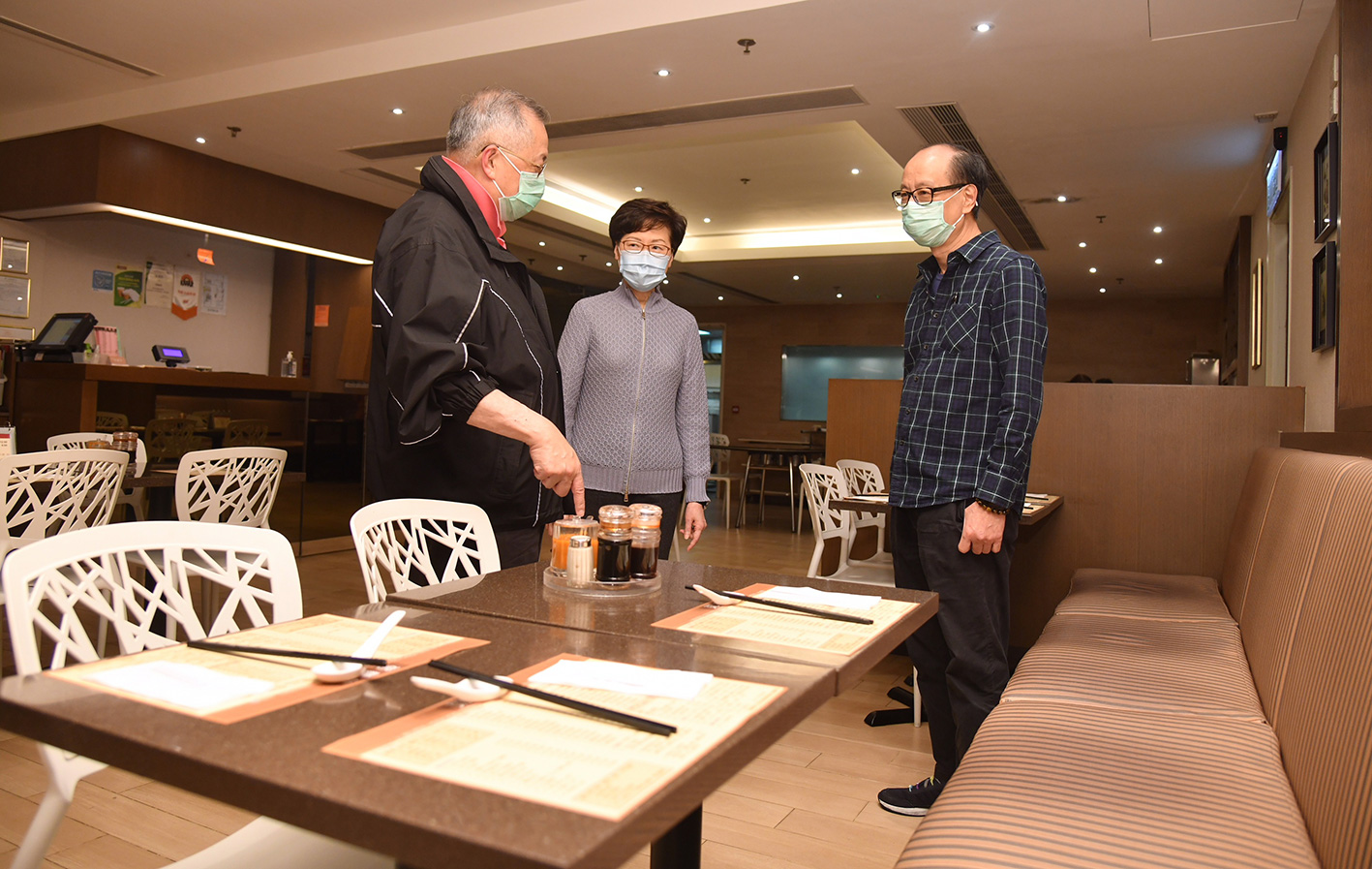 林鄭月娥在行政會議成員張宇人陪同下視察一間酒樓及一間食店,從負責人口中得悉該處已按法例規定落實多項減低病毒傳播風險的措施,而且與其他很多食肆一樣,採取了提供外賣折扣、安排一些客人面向同一方向的座位等自發行動,配合抗疫。她知道酒樓及食店的顧客普遍認同政府加強市民社交距離的目標,對各項衞生安排不持異議。她亦感謝食肆員工在抗疫期間作出的努力,表示政府在制訂新一輪援助業界的措施中,會特別關顧員工承受的壓力。