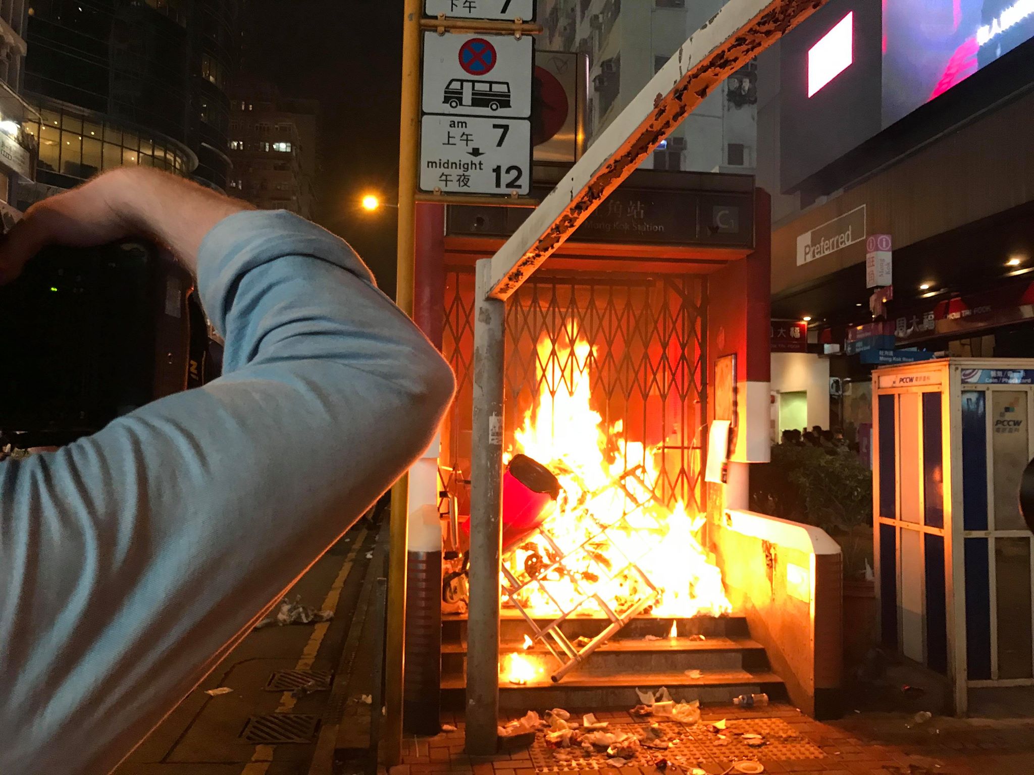 2019年11月3日,大批示威者在旺角聚集。其中一名20歲男子把發泡膠盒及木板投入火堆中助燃,令港鐡旺角站C1出口損毀。