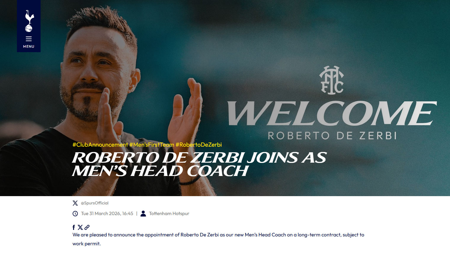 英超球隊熱刺宣布,任命迪些比為新任主帥,雙方簽署長約,但未有透露年期。