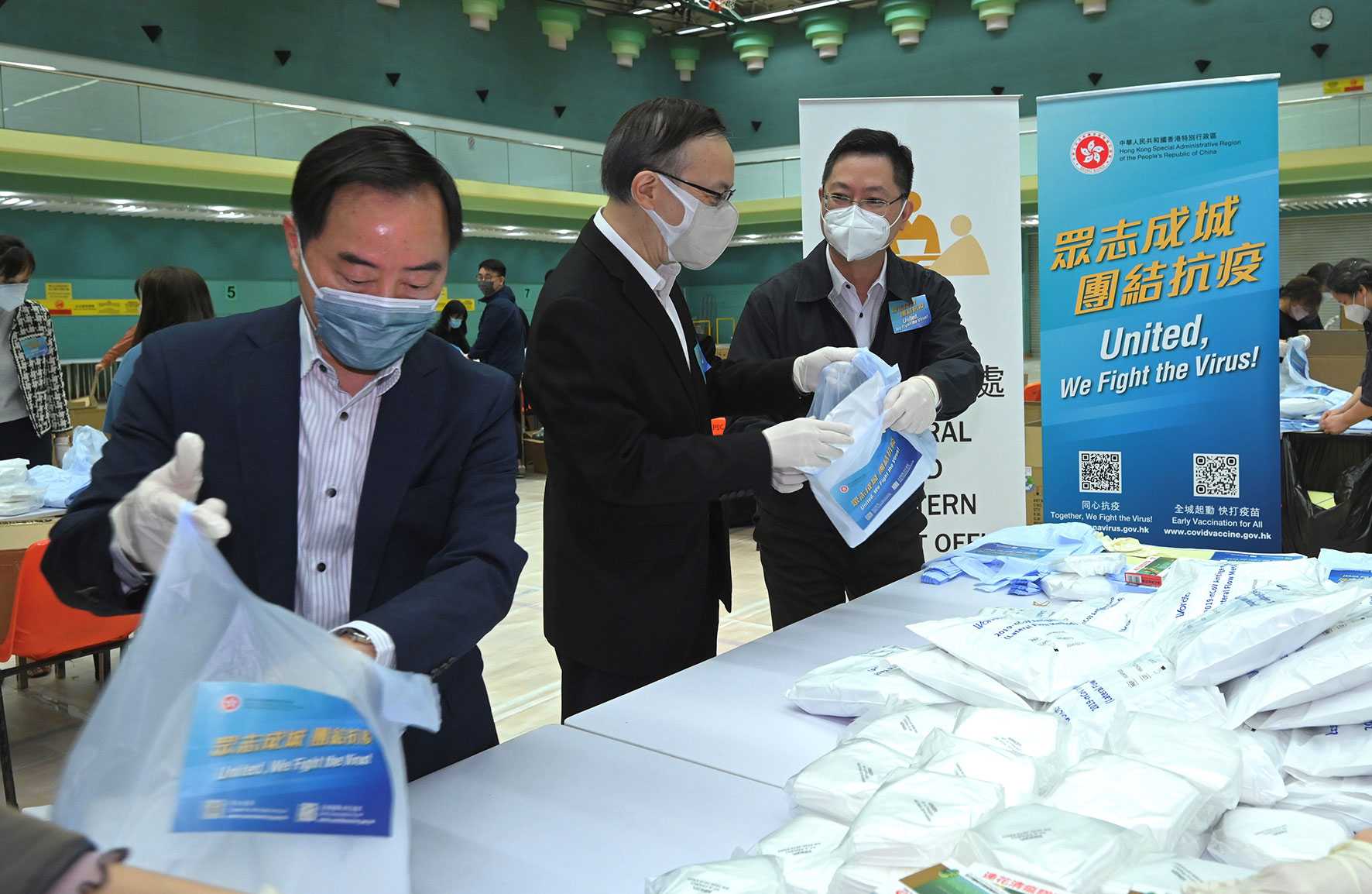 政府感謝一眾立法會議員、「全港社區抗疫連線」、18區社區抗疫連線、超過350個地區組織及非政府機構、同鄉會、善團、義工、制服團體、青年組織、宗教團體及少數族裔服務機構等動員共超過17000名義工在133個包裝中心參與包裝工作。此外,政府亦感謝13個政策局和轄下部門及律政司的公務員同事積極配合,共動員近2000名同事協助包裝,讓政府得以在短短三日內順利完成約350萬個「防疫服務包」的包裝工作。