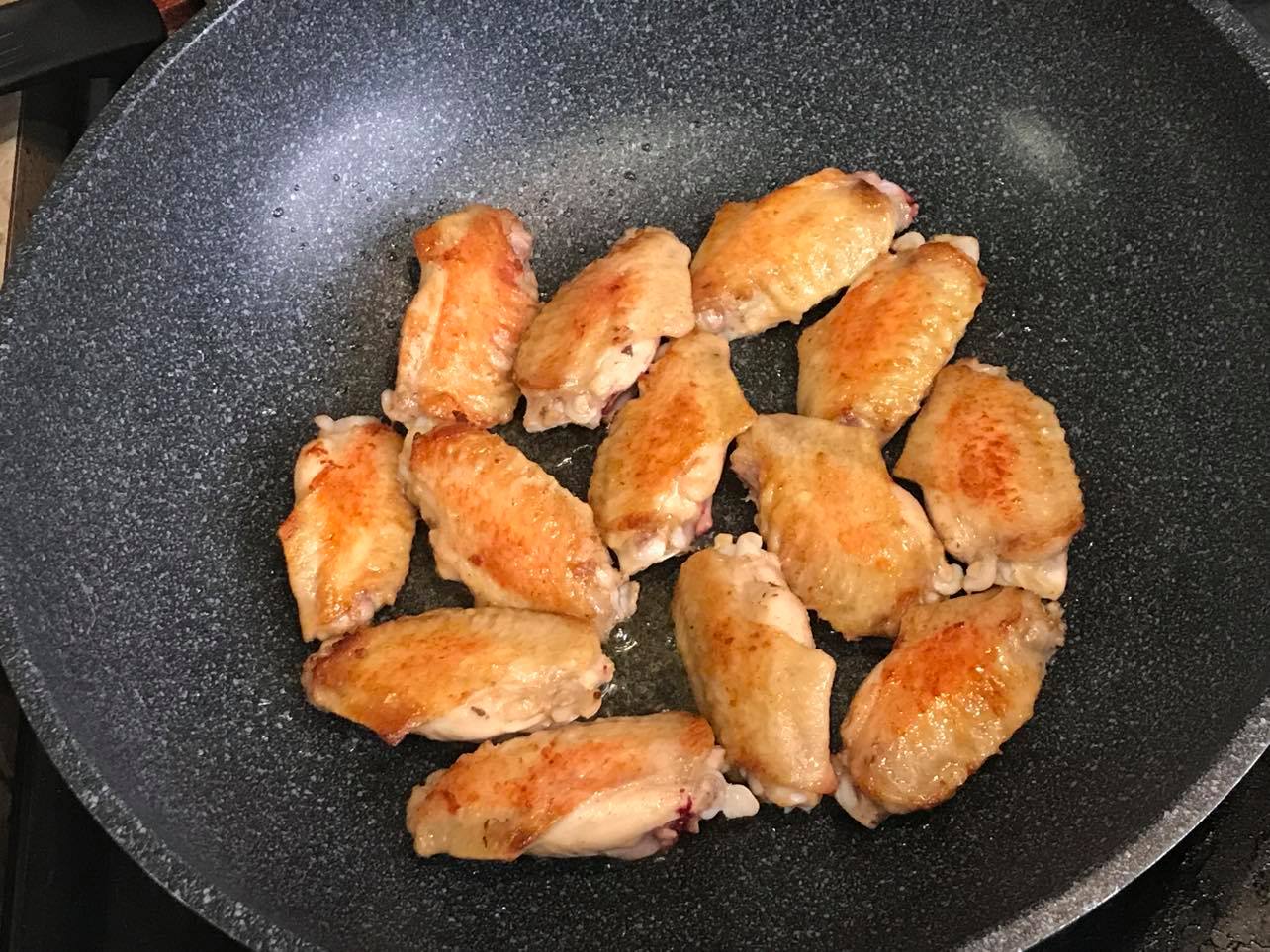 (3)用易潔鑊/不黏鍋,落少少油,放入雞翼,以中小火煎香雞翼兩邊,(如果想要香脆雞翼,此時要煎至全熟),夾起。