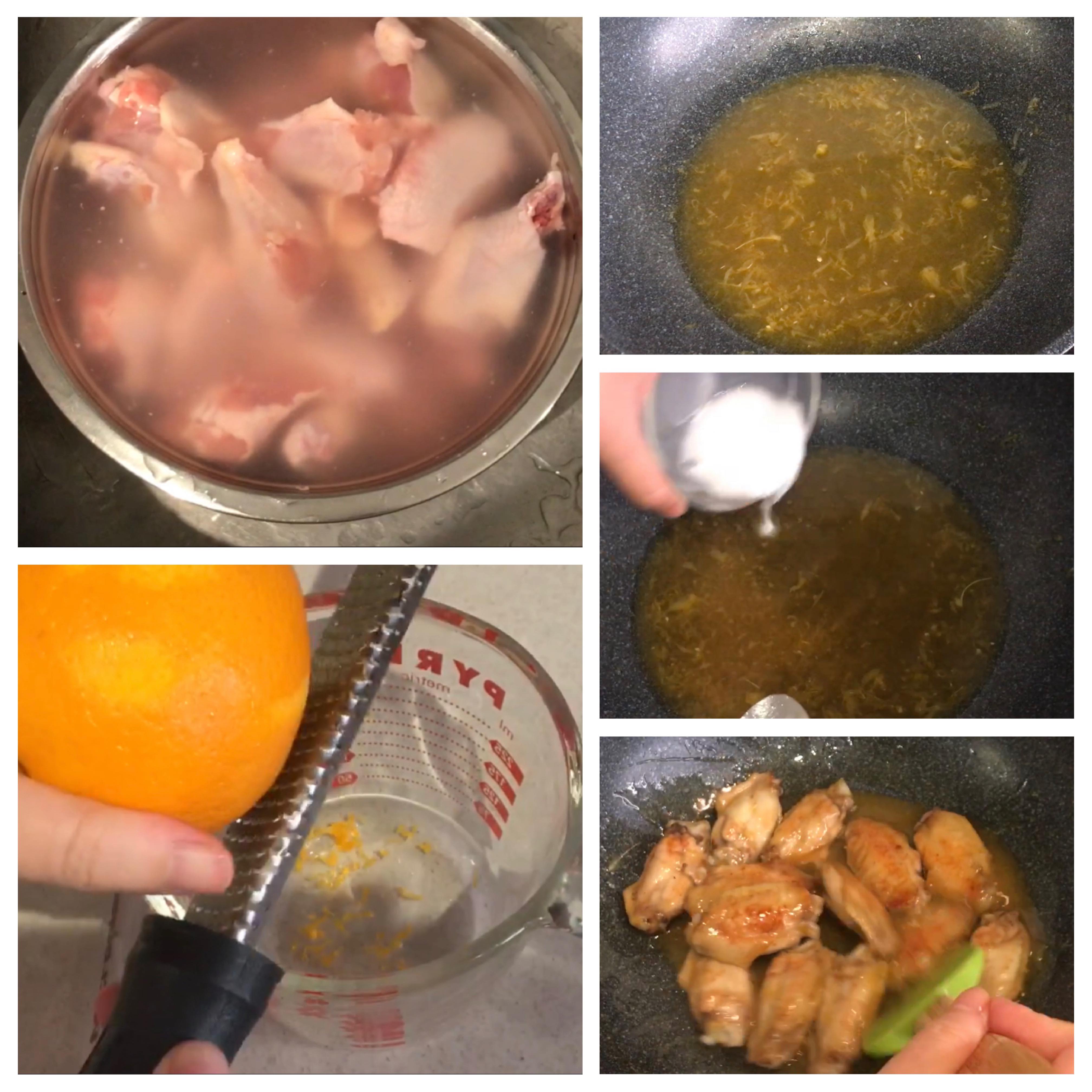 (4)將橙片開兩半,預留些少作伴碟,然後榨汁,易潔鑊中倒入橙汁和蜜糖/豉油/米醋,不斷煮至滾,倒入生粉水,輕輕拌勻,倒入雞翼,煮至醬汁開始收汁,即可上碟食用。(如想醬汁作蘸醬汁伴食,將醬汁煮至稠即可)