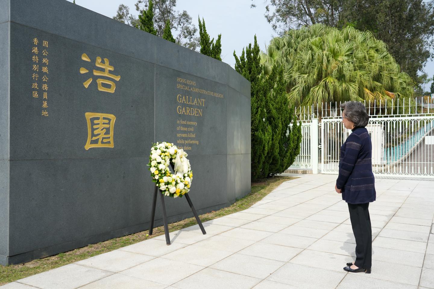 楊何蓓茵表示,長埋浩園的公僕,來自政府不同部門和職級,他們克盡厥職的專業精神,定將永存我們心中。此外,她亦到景仰園向菲律賓馬尼拉人質事件的死難者獻花致意。
