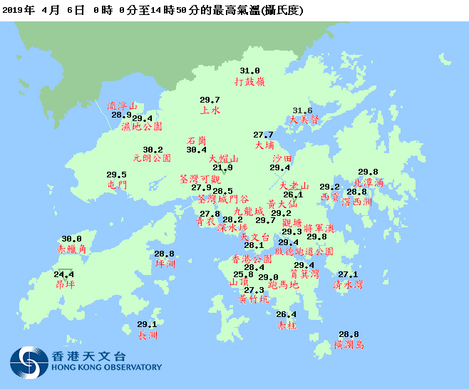 首頁港聞港聞 市區今午錄28.1度 創今年新高 作者:熱血編輯部 (陳五) 04-06-2019 Like Facebook Twitter 更多 Like105 分享0 留言0 今個長假期風和日照,天文台今午(4月6日)在市區錄得28.1度,創今年新高。天文台表示,廣東沿岸地區天色大致良好。正午時分,本港大部分地區氣溫上升至27度或以上,打鼓嶺及大美督更分別錄得31及31.6度,猶如夏天。在大球場舉行的國際七人欖球賽,現場觀眾們都熱情如火。 根據天文台九天天氣預測,未來4日市區最高氣溫料達28度,不過一股達強風程度的偏東氣流會在下周後期影響沿岸地區,該區天氣稍涼。 (天文台圖片)