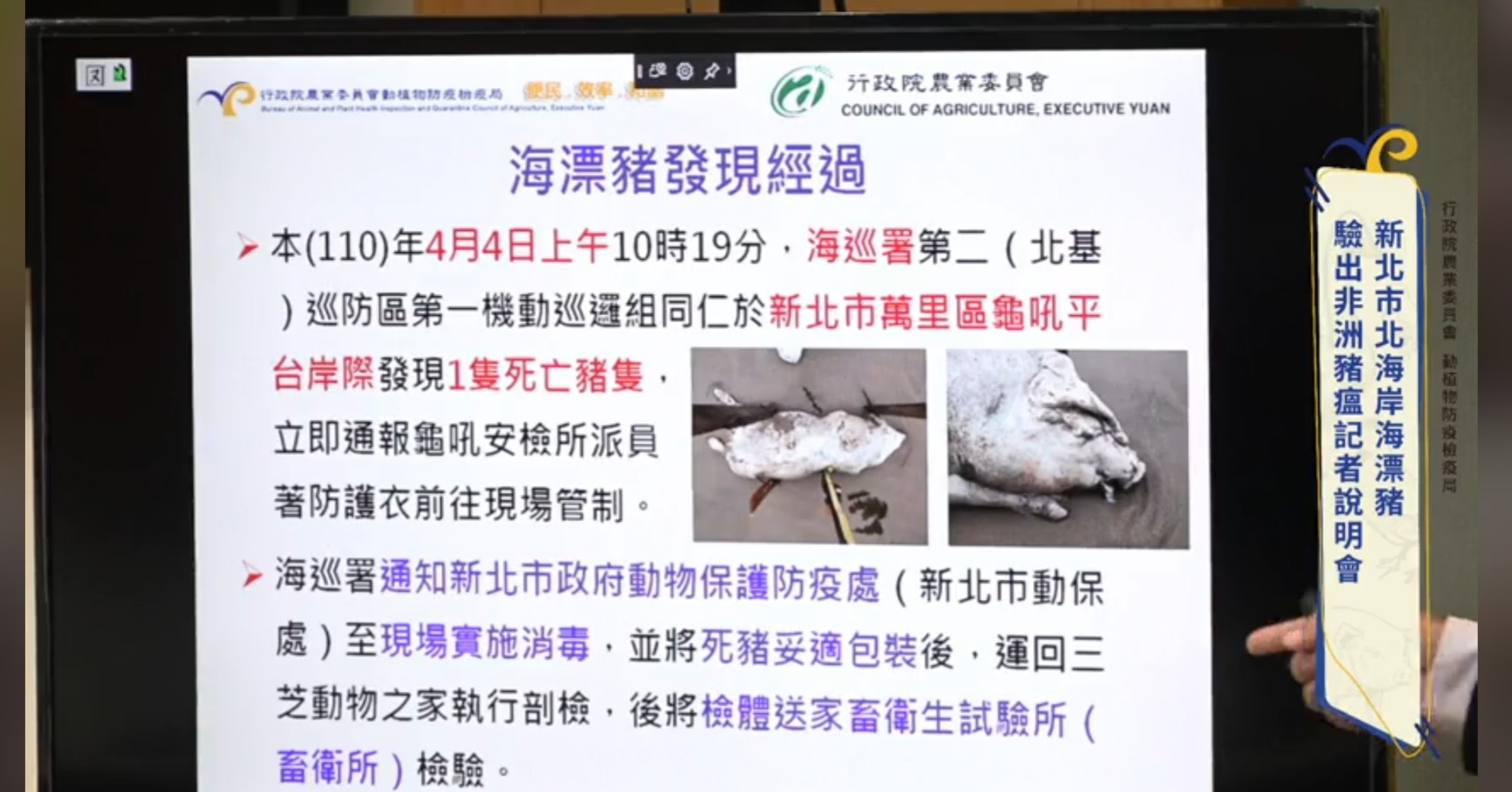 台灣新北市萬里區發現死豬浮屍,當地農委會防檢局今日(4月6日)召開記者會,宣布該豬隻驗出非洲豬瘟病毒呈陽性,目前已協同新北市政府進行防疫措施。