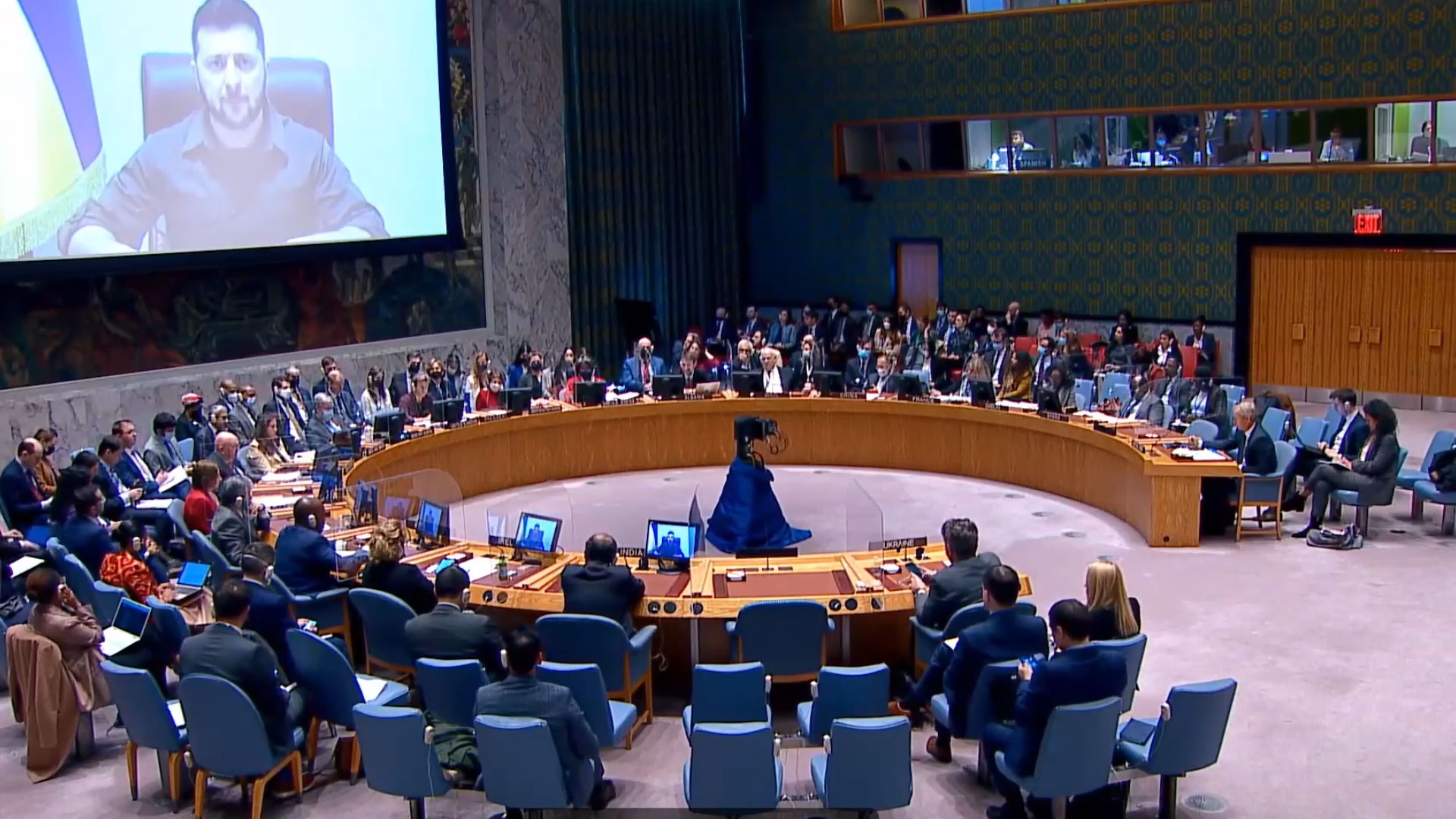 自俄羅斯入侵烏克蘭以來,澤連斯基首次對聯合國安理會發言。他指控俄軍殺害平民及性強暴女性。
