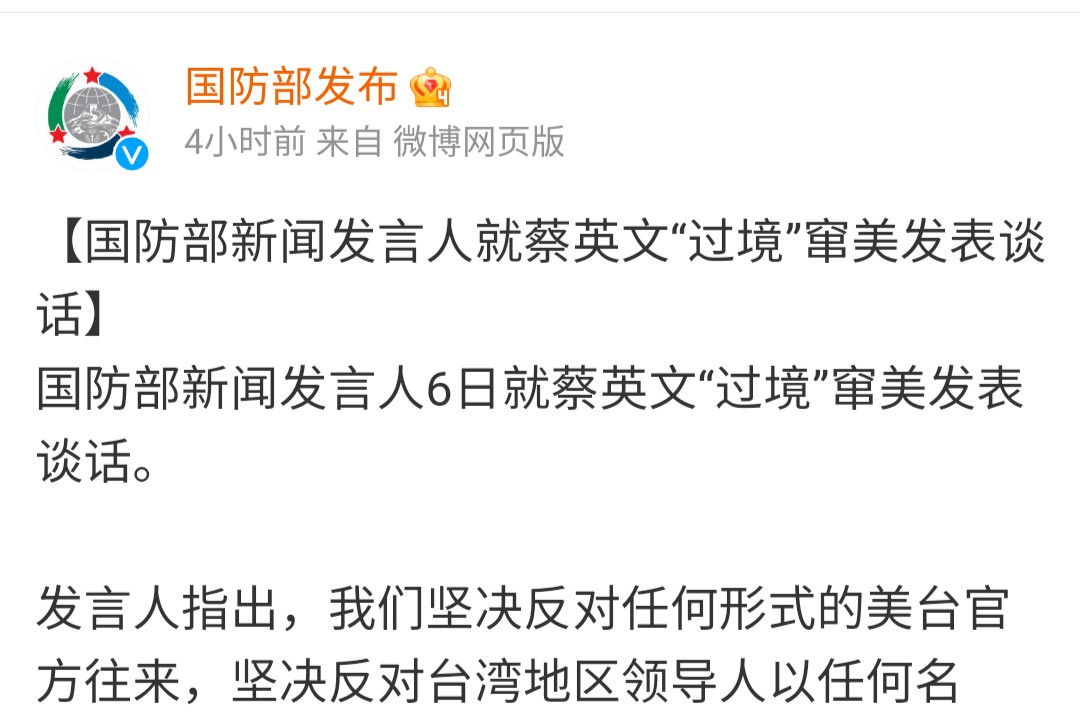 美國眾議院議長麥卡錫周三(4月5日)在加州列根圖書館,與過境美國的蔡英文會面,中國國防部新聞發言人發聲明,堅決反對任何形式的美台官方往來,堅決反對台灣地區領導人以任何名義、任何理由竄美,堅決反對美方違反一個中國原則和中美三個聯合公報規定,同民進黨當局進行任何形式的接觸。