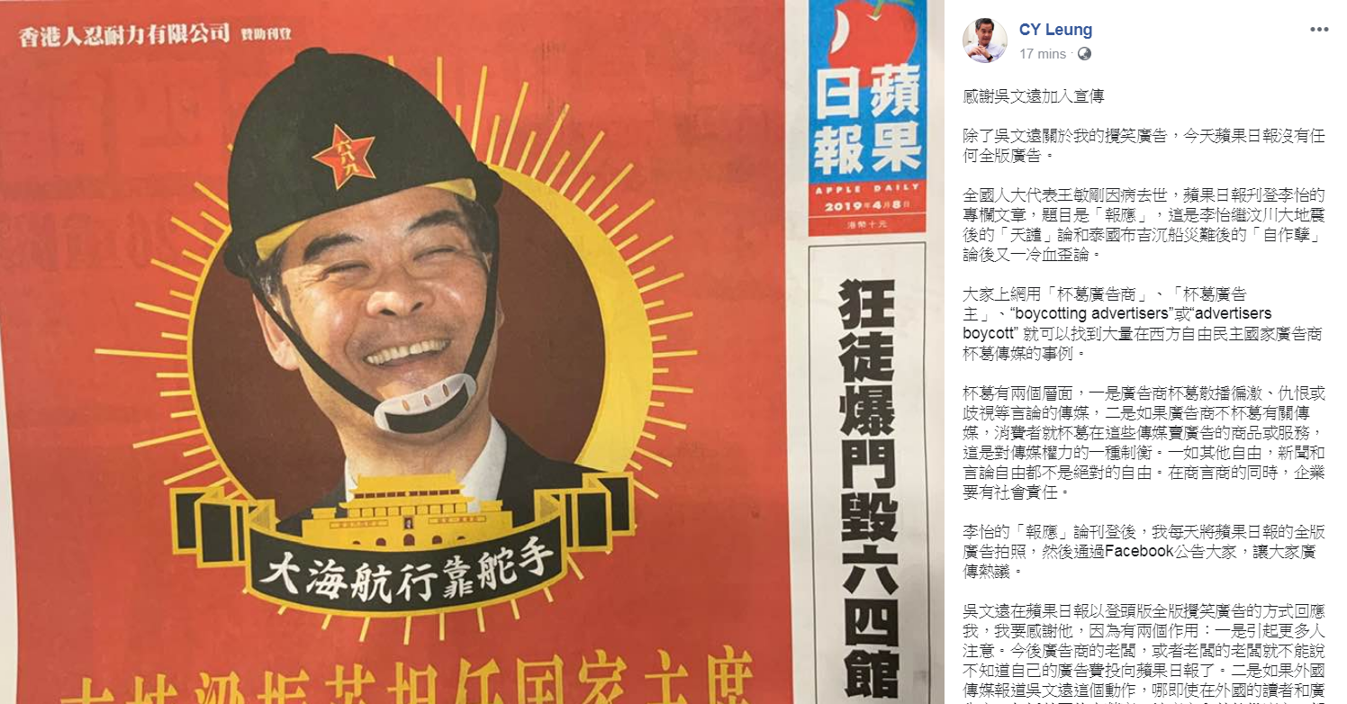 前特首梁振英連日來在其Facebook專頁貼出《蘋果日報》全版廣告之相片,呼籲支持者杯葛廣告商,令外界質疑他打壓新聞自由。社民連主席吳文遠乘機發起眾籌活動,集資在《蘋果日報》刊登全版廣告「問候梁振英」,有關廣告今早在《蘋果日報》刊出,標題為「支持梁振英擔任國家主席,盡快北上取代習總」,梁振英則繼續在Facebook專頁中貼出有關廣告相片,並留言「感謝吳文遠加入宣傳」。