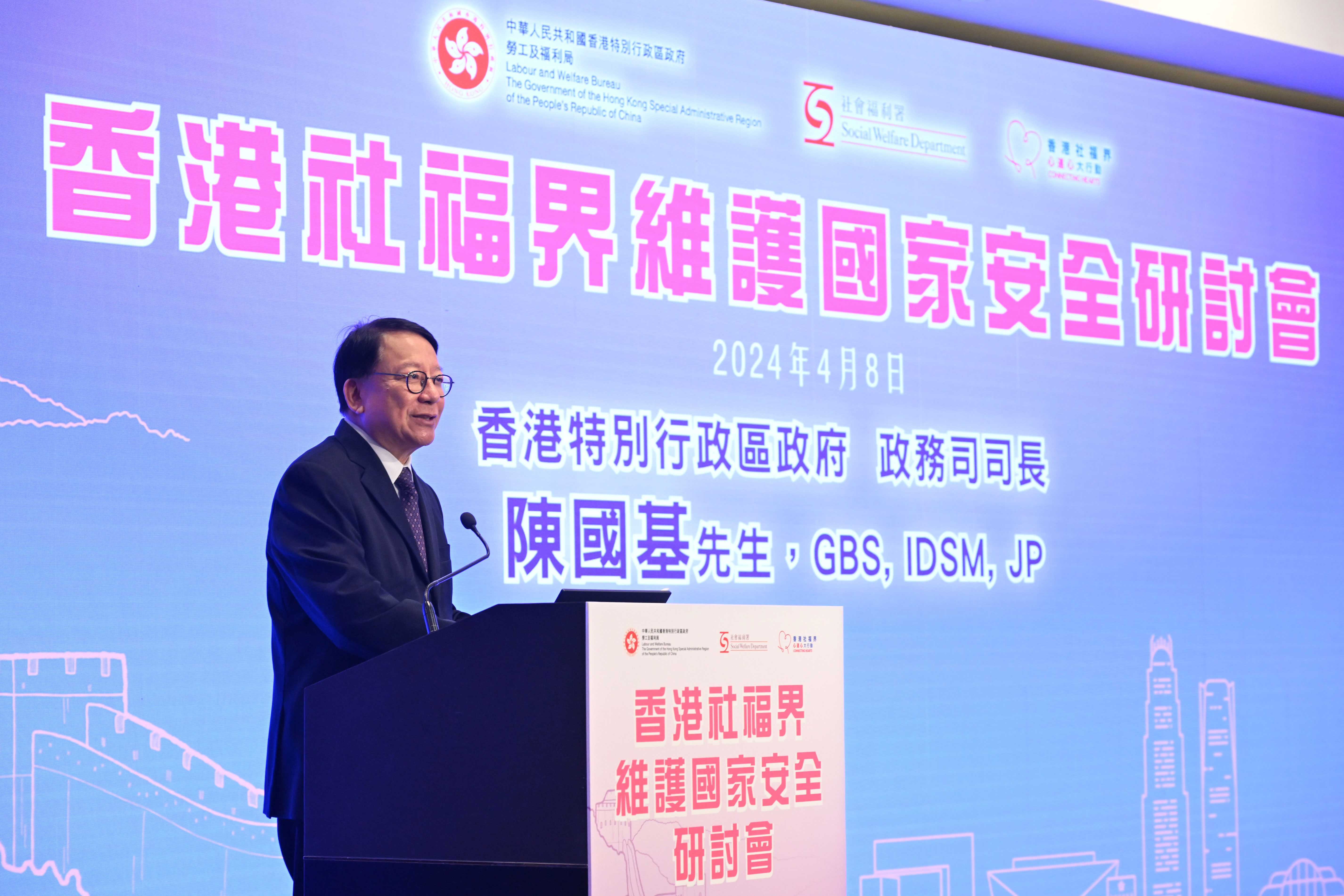勞工及福利局、社會福利署和香港社福界心連心大行動今日(4月8日)聯合舉辦香港社福界維護國家安全研討會,促進香港社福界了解維護國家安全、落實《香港國安法》和《維護國家安全條例》對市民福祉的重要性,從而進一步增強業界維護國家安全的意識。