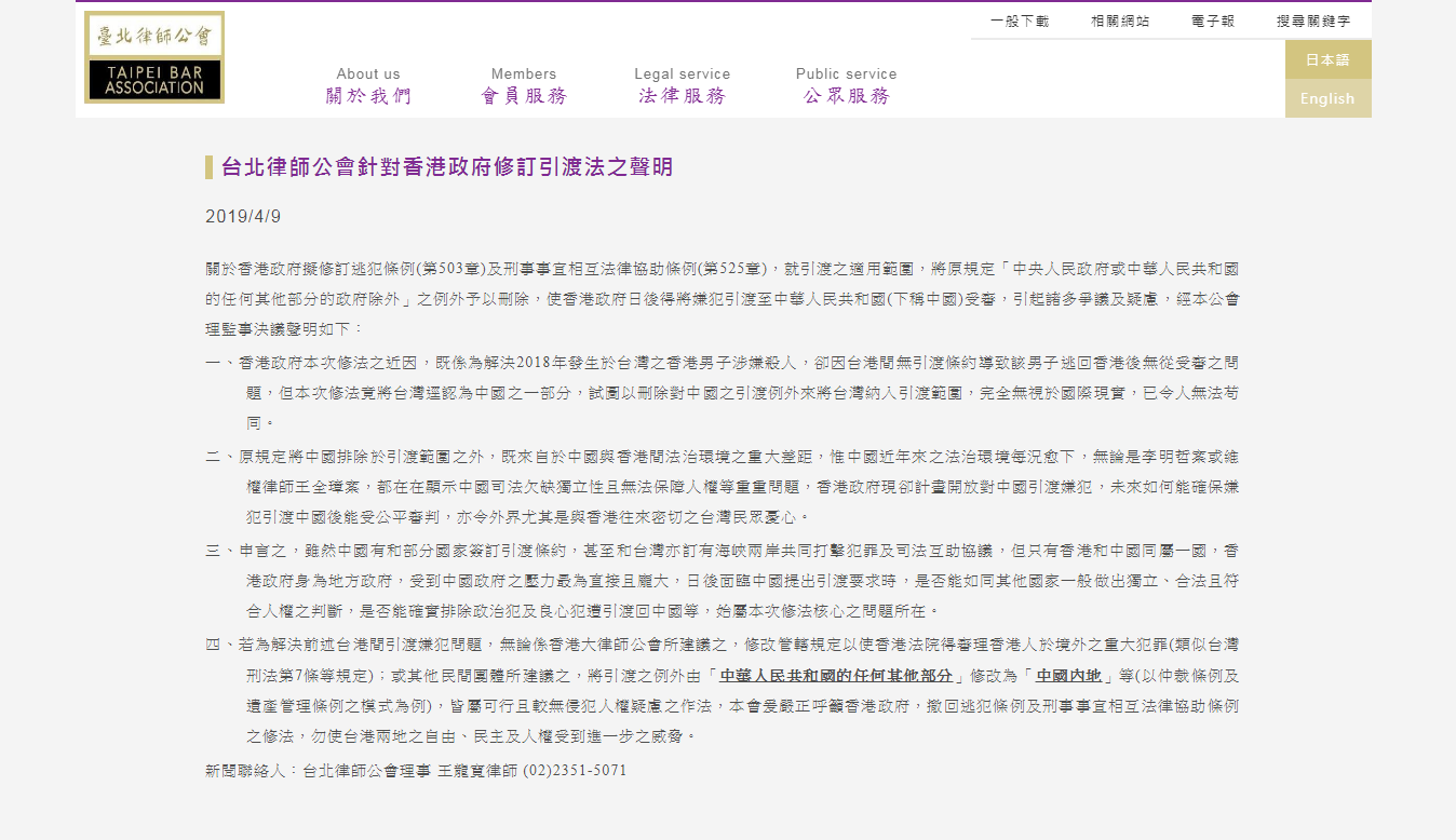 就港府計劃修訂《逃犯條例》,台北律師公會今日發表聲明,嚴正呼籲港府撤回修訂,勿使台港兩地之自由、民主及人權受到進一步威脅。
