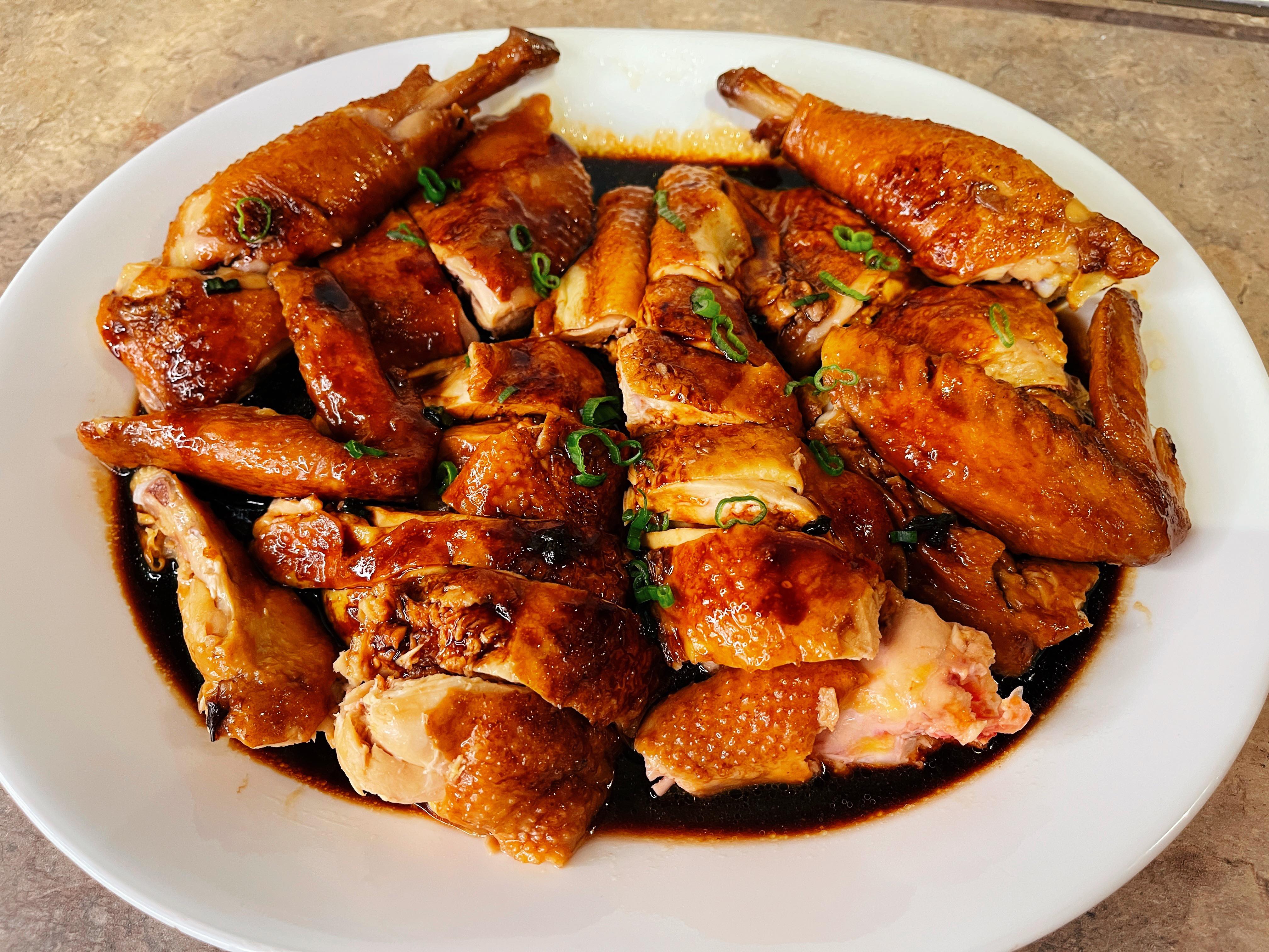 (4)將醬汁過篩,然後將汁去油,倒回鑊中煮熱,加入1匙玫瑰露酒,煮至自己喜歡的濃稠度,加入蔥花,淋在雞上或倒入碗中蘸來吃也可。