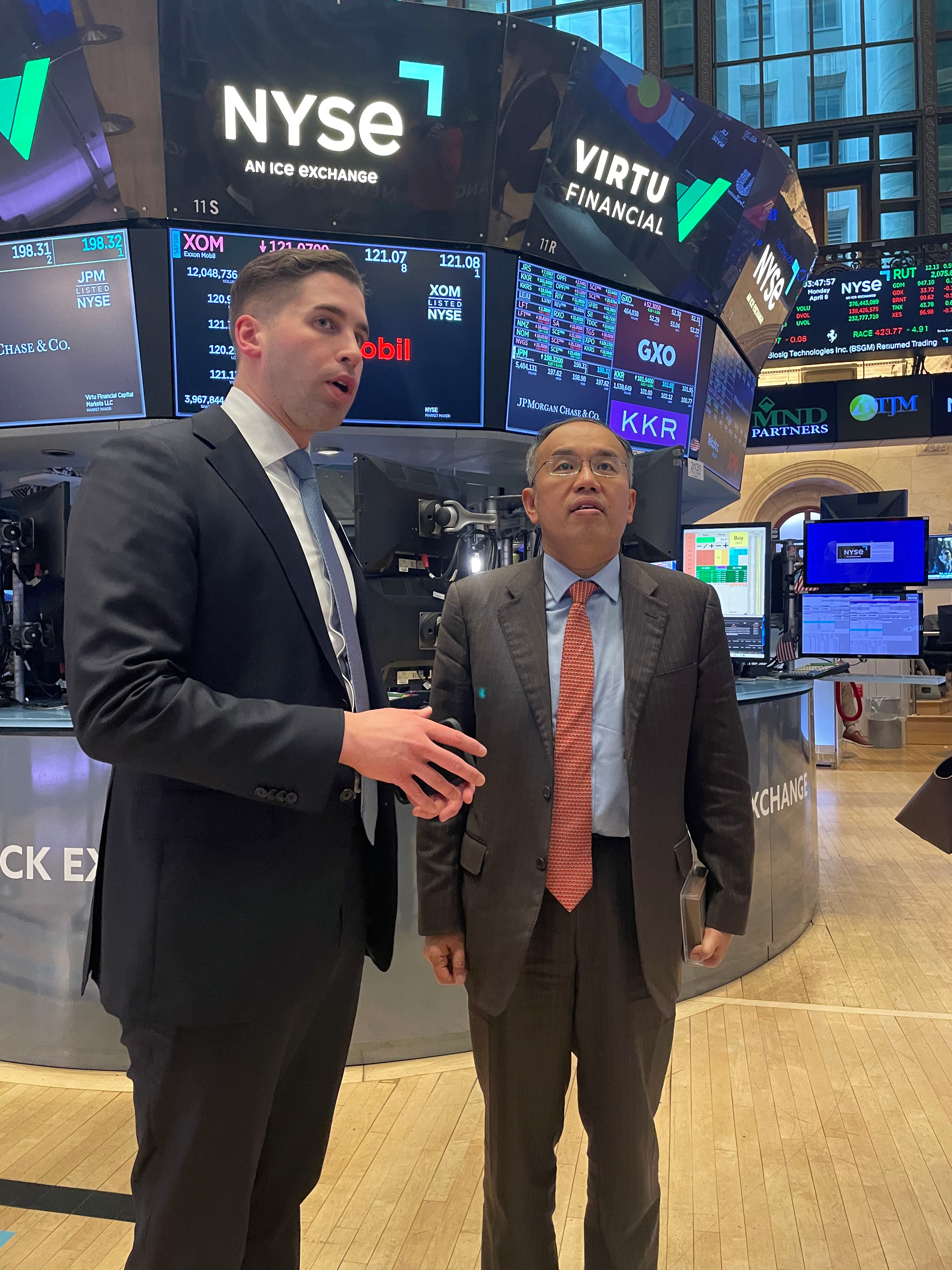 下午,許正宇到訪紐約證券交易所,與該交易所副總裁及全球諮詢主管Chris Taylor和營運董事兼學院院長Will Goodwin會面。許正宇與他們分享香港在外圍環境挑戰下,為增強股票市場流動性和競爭力所實施的措施。