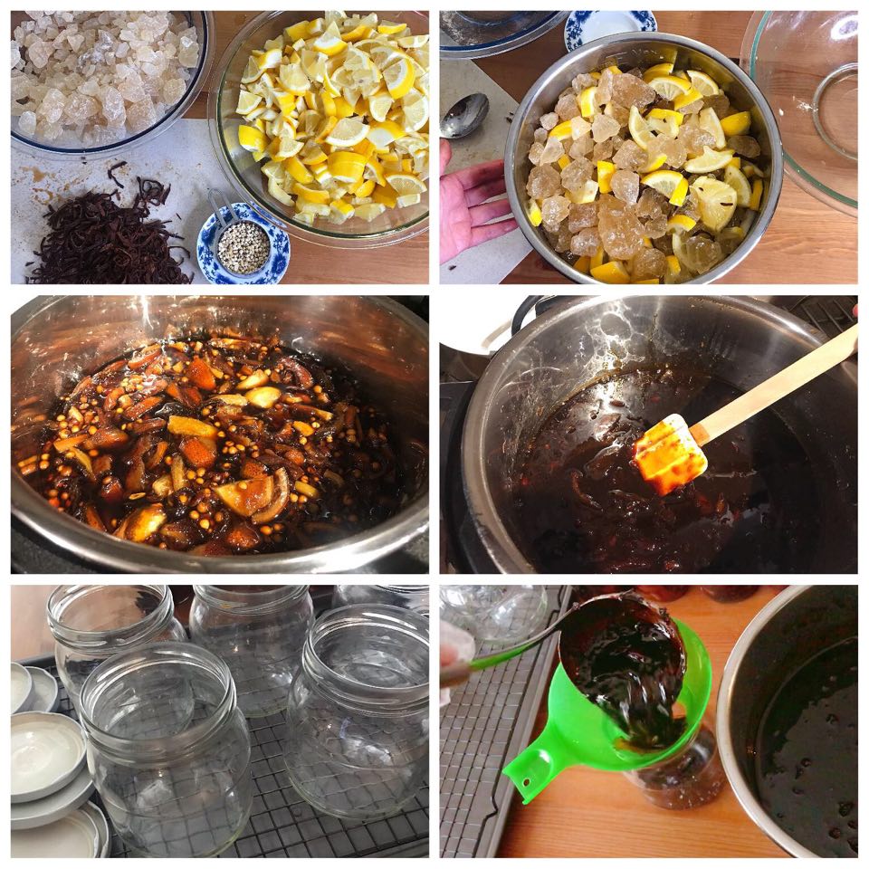 (2)我試煮的經驗:將電子壓力煲手調低壓(low pressure)或用炖用(stew)模式,煮120分鐘/2小時,再自然放氣60分鐘/1小時,攪拌幾下,再以手調低壓(low pressure)或用炖用(stew)模式,煮60分鐘/1小時,再自然放氣30分鐘/半小時,(我因太夜的關係要去睡,所以蓋蓋5小時,因此早上起來我覺得檸檬已焗得太淋而且仍未夠稠身,所以要撈起所有餡,以慢煮模式(slow cook)打開電子壓力煲蓋煮至汁稠身再放回餡太約用了1-2小時)(我換上一個合用的玻璃蓋蓋上)。