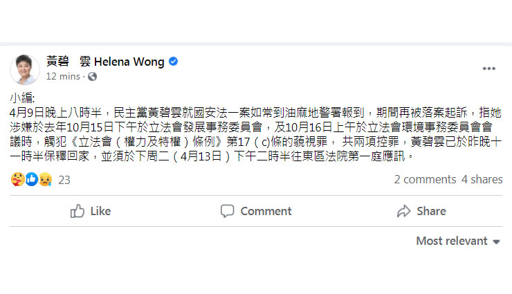 民主黨前立法會議員黃碧雲於社交網站表示,周五(4月9日)她就國安法一案如常到油麻地警署報到,期間再被落案起訴。