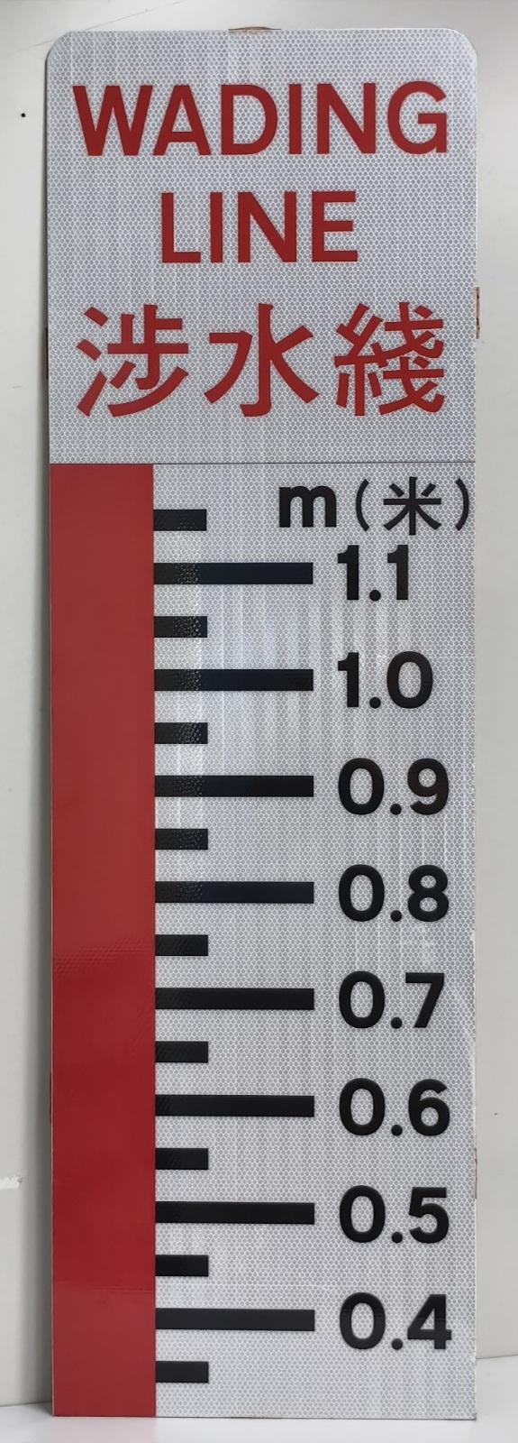 涉水綫系統的警示標記設於低窪行車路段,包括路面漆有紅色波浪綫及涉水綫字樣,旁邊有水位標尺,而行車道旁會豎立標誌牌。當積水觸及或淹沒涉水綫時,表示前方道路最低點的積水深度已達0.3米或以上。