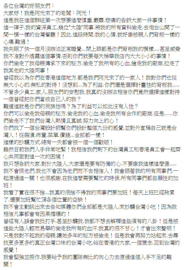 該名「阿元來了」的員工,分享了老闆「想告訴在香港的台灣朋友一些心裡話」,老闆阿元在文中提到,幾名來自大陸的資深員工,偷走了她母親傳承下來的秘方,偷走了他所有的心血,更搶走他的廠商,並拉走其他的大陸同事,形容就像被親人們背叛一樣的心痛,難過。