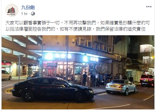 事後有網民直指涉事餐廳名叫「九份飽」,該店的Facebook專頁隨即貼文還擊,指「大家可以觀看事實勝于一切,不用再攻擊我們,如果確實是抄襲什麽的可以從法律層面控告我們的,如有不便請見諒,我們保留法律的追究責任」。