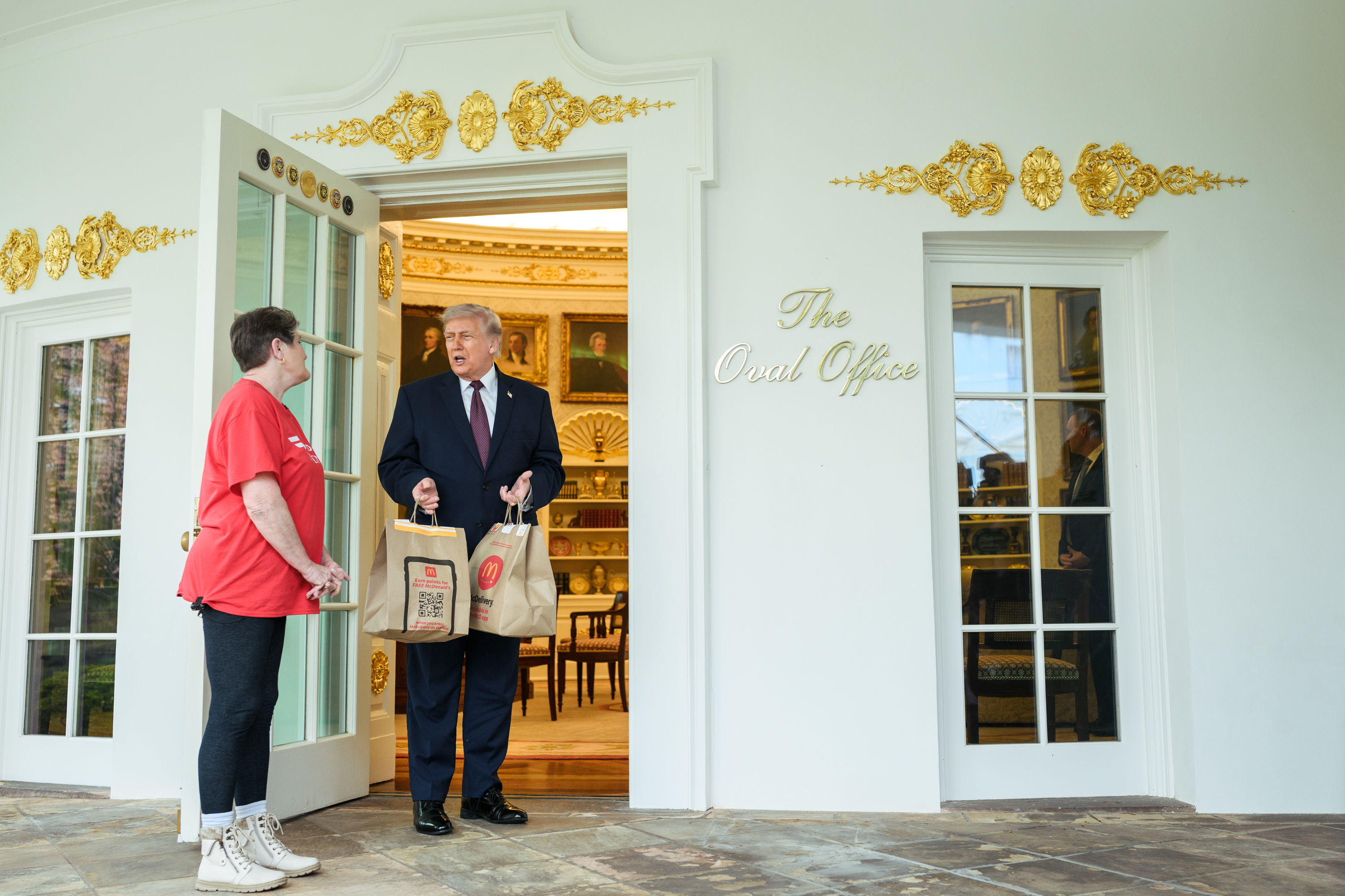白宮表示,訂單包括漢堡和薯條,總統隨後親自將食物分發給了他的西翼幕僚。