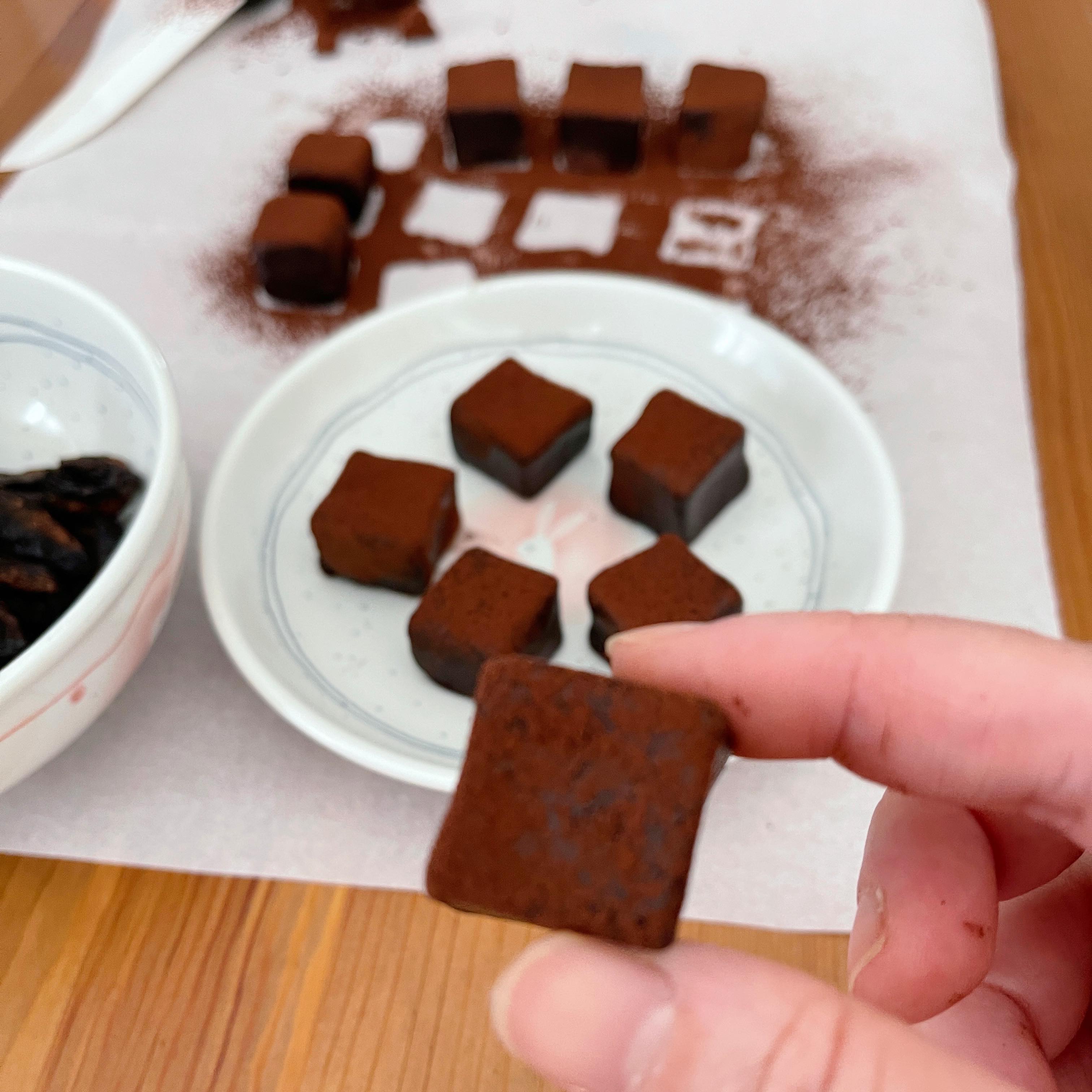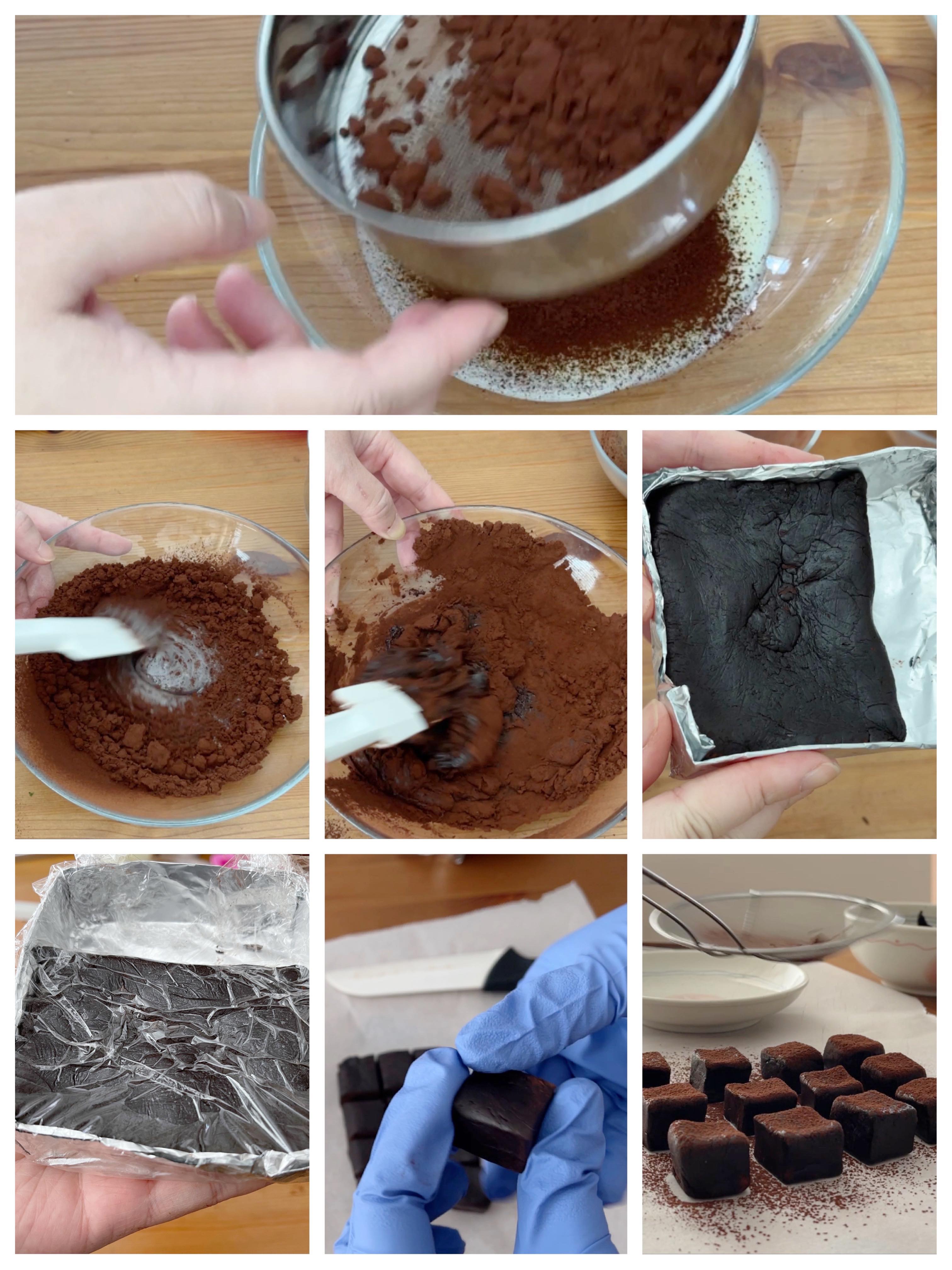 (3)用刀切成一粒粒,帶上手套將每粒松露朱古力定型,然後撒上可可粉即可食用。