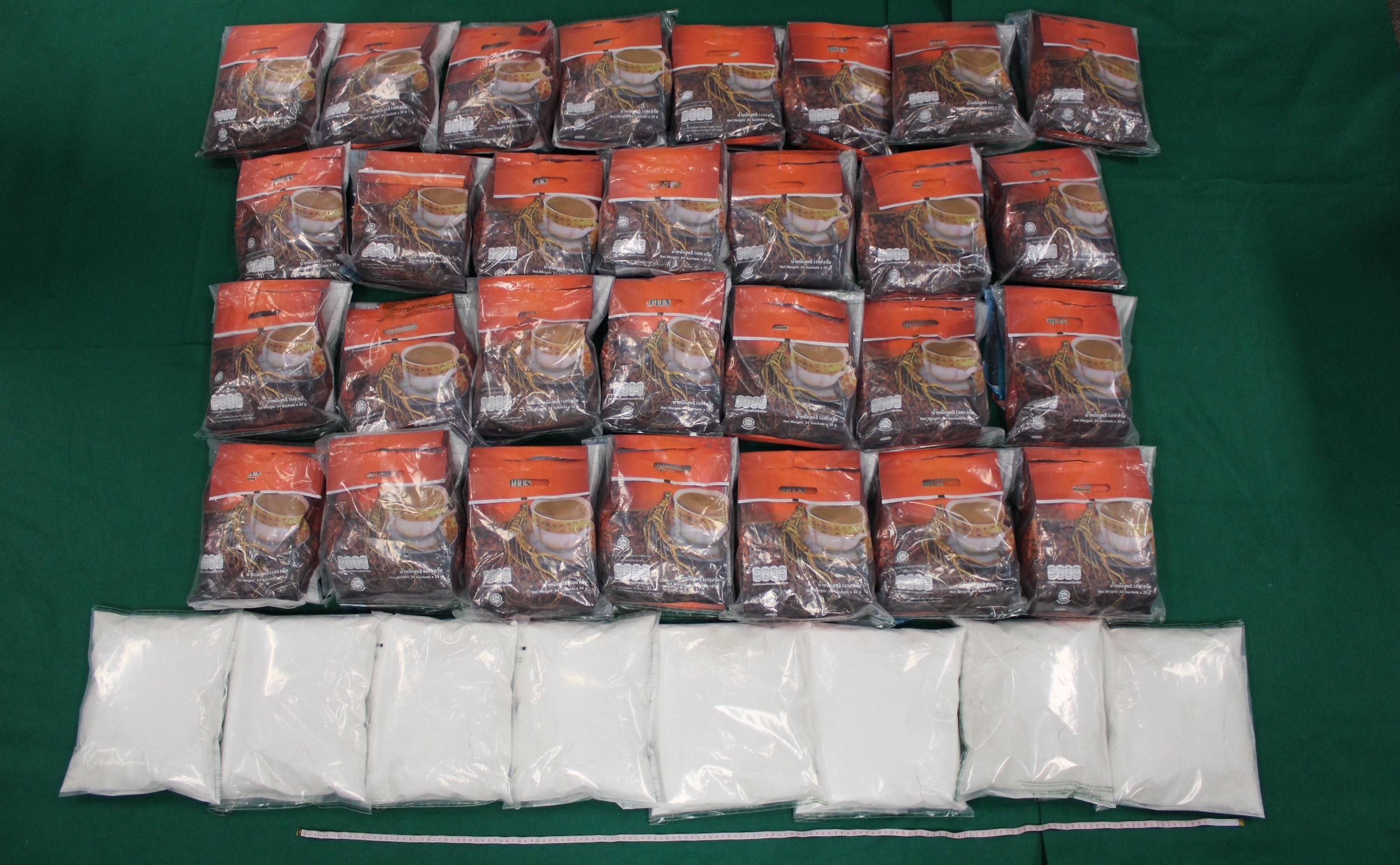 海關昨日透過情報交流及風險評估,在機場查驗一批泰國抵港,報稱載有蔬菜的空運貨物。經檢查後,海關人員在其中3箱貨物內的37包咖啡粉包裝袋中,發現懷疑海洛英,共重約53公斤,估計市值約4900萬元。一名36歲的懷疑涉案男子被捕。