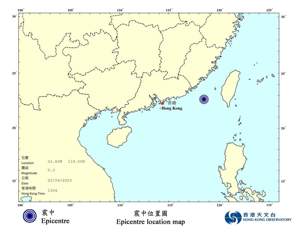 據香港天文台的初步分析,今日(4月22日)下午1時04分台灣以西海域發生一次5.3級地震,震央位於北緯22.60度,東經118.50度附近,即高雄之西約190公里,即距離香港之東約450公里,震源深度約10公里。