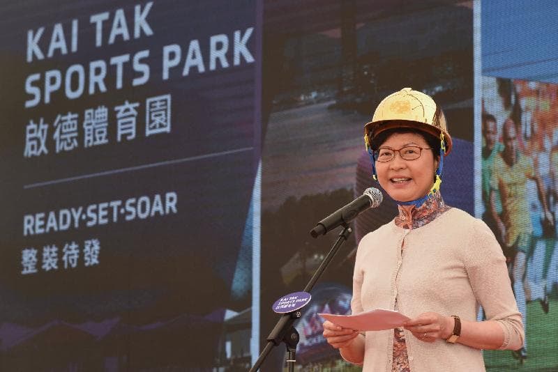 林鄭致辭時指,啟德體育園是政府近數十年、甚至可以說是有史以來在體育基建方面的最重要投資,建成後將是全港最大的體育設施,提供現代化和多用途的體育和休憩場地,對推動體育普及化、精英化和盛事化都有重大作用。