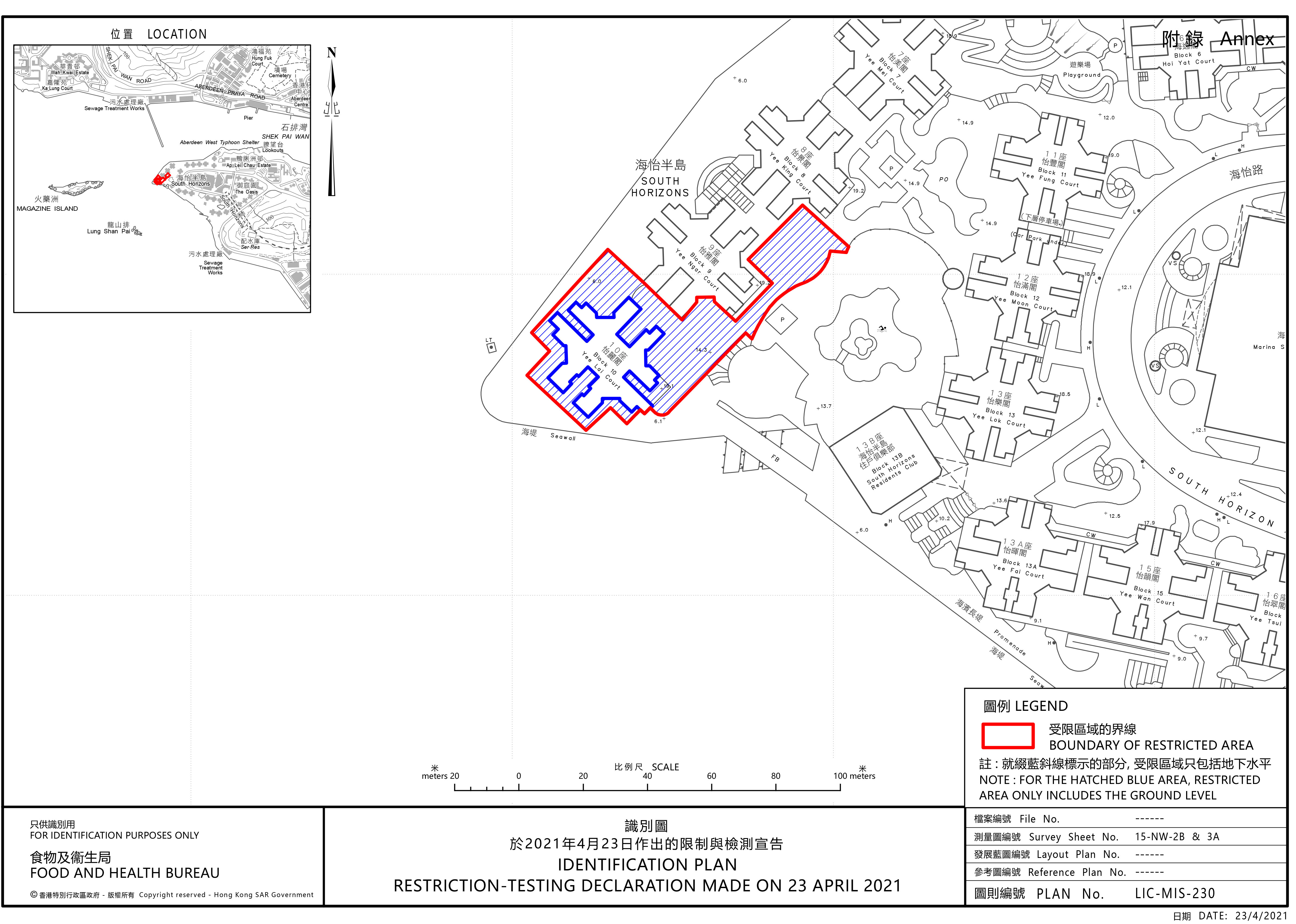 政府今日(4月23日)引用《預防及控制疾病(對若干人士強制檢測)規例》(第599J章),作出限制與檢測宣告,自晚上8時30分起限制在鴨脷洲指明「受限區域」,即鴨脷洲海怡半島第10座(怡麗閣)內的人士須留在其處所並接受強制檢測。受檢人士須在其處所等候,直至區內所有已識別的受檢人士完成檢測,而相關檢測結果亦已獲大致確定,方可離開其處所。政府目標是在明日(4月24日)上午約8時左右完成此行動。