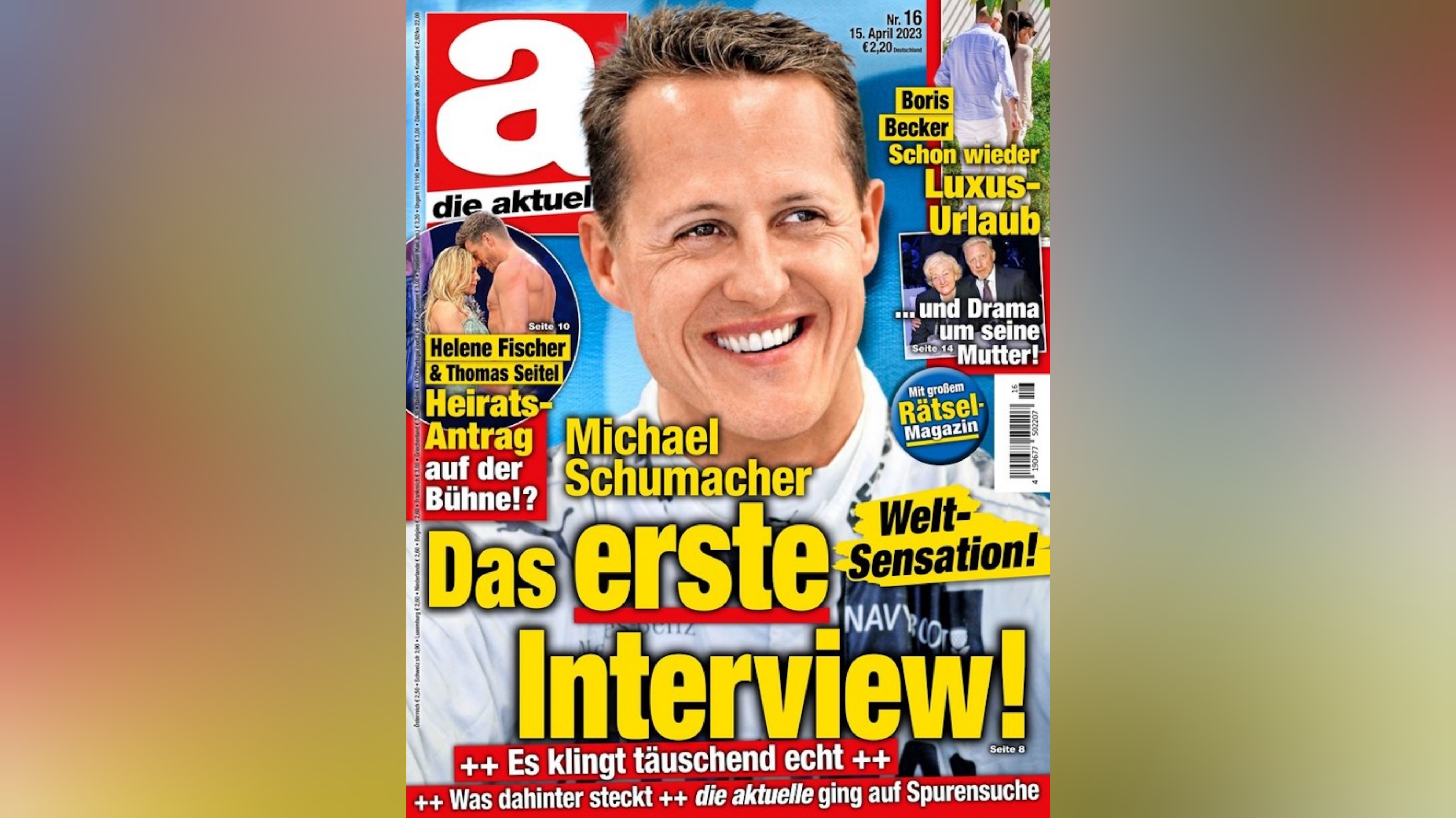 最新一期《Die Aktuelle》封面刊登舒麥加微笑的照片,標題寫著「舒麥加,首度受訪」,小標寫著「這聽起來像是真的。」但翻開內頁後,讀者卻發現內文「引述」全都是由AI生成。