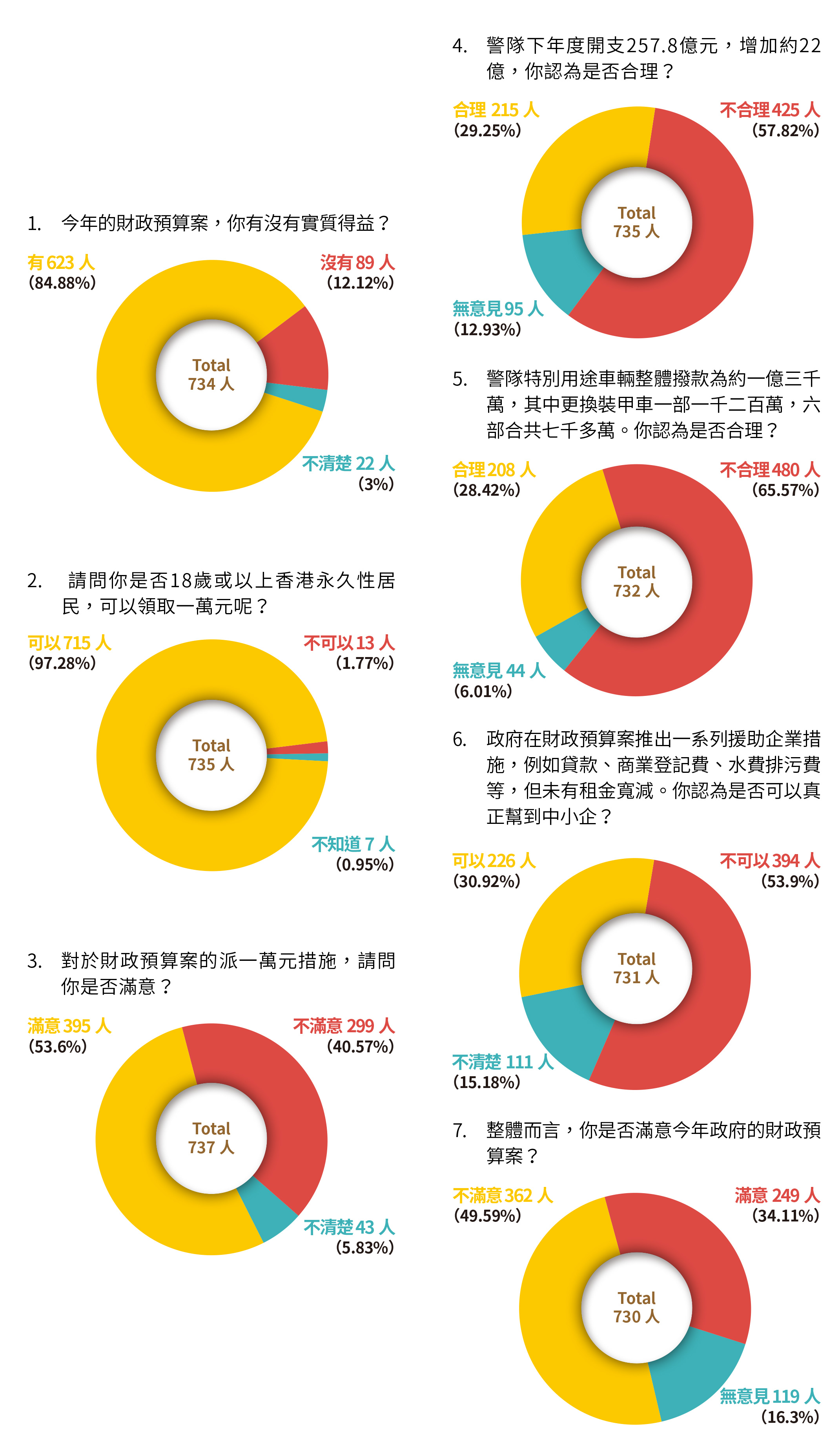 整體而言,滿意今年政府的財政預算案的人只有三成半(249人,34.11%),不滿者近五成(362人,49.59%),無意見的有一成半(119人,16.3%)。由此可見,縱使政府推出不少「紓困措施」,在今時今日的市民眼中,無有實質助益,難平民憤。
