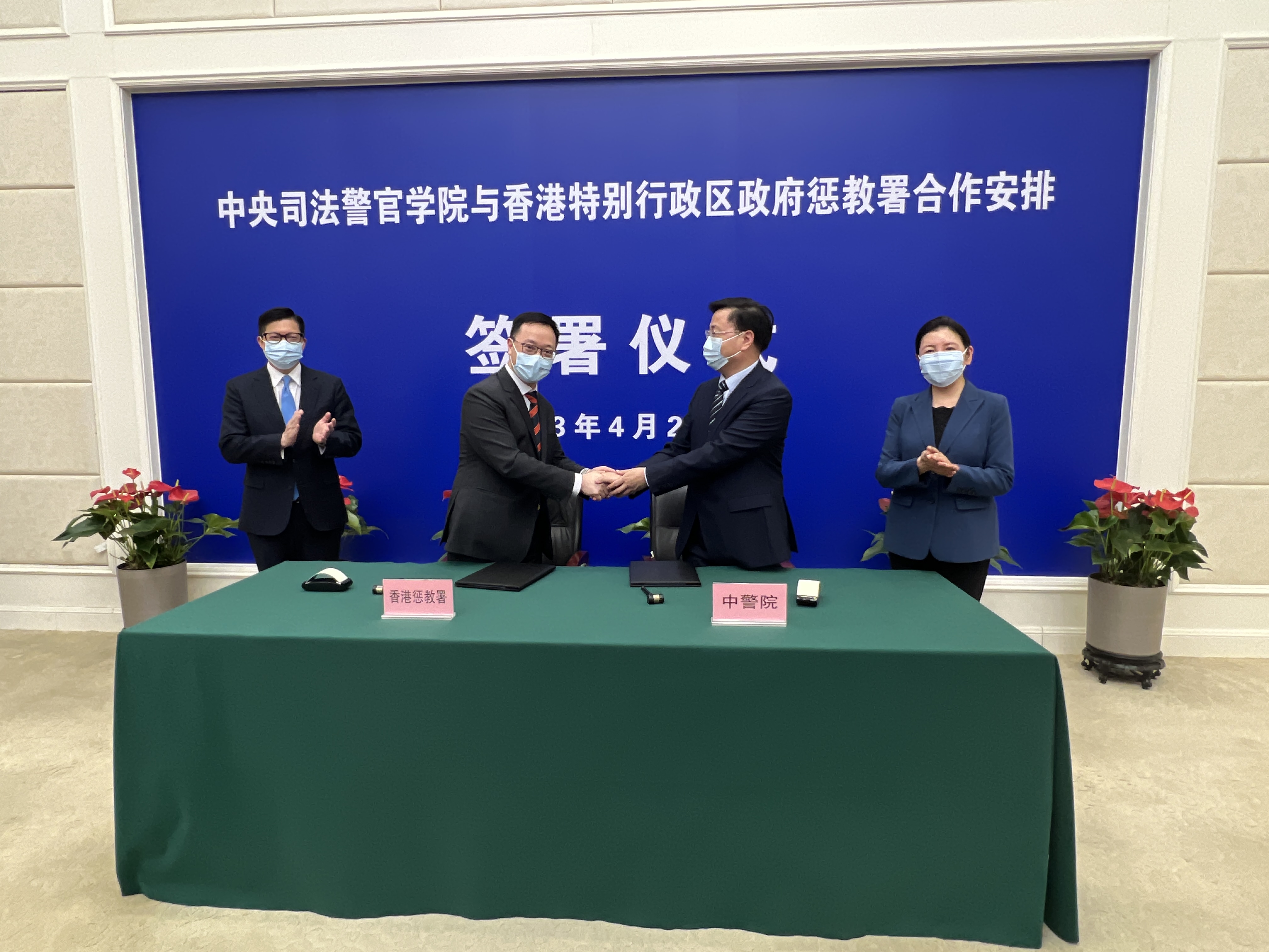 下午,鄧炳強拜會司法部部長賀榮,就兩地懲教機構在科技應用和更生方面的經驗作交流,兩人亦見證懲教署署長黃國興與中央司法警官學院院長章恩友簽署新一份合作協議,深化雙方互訪交流、培訓和學術合作等。