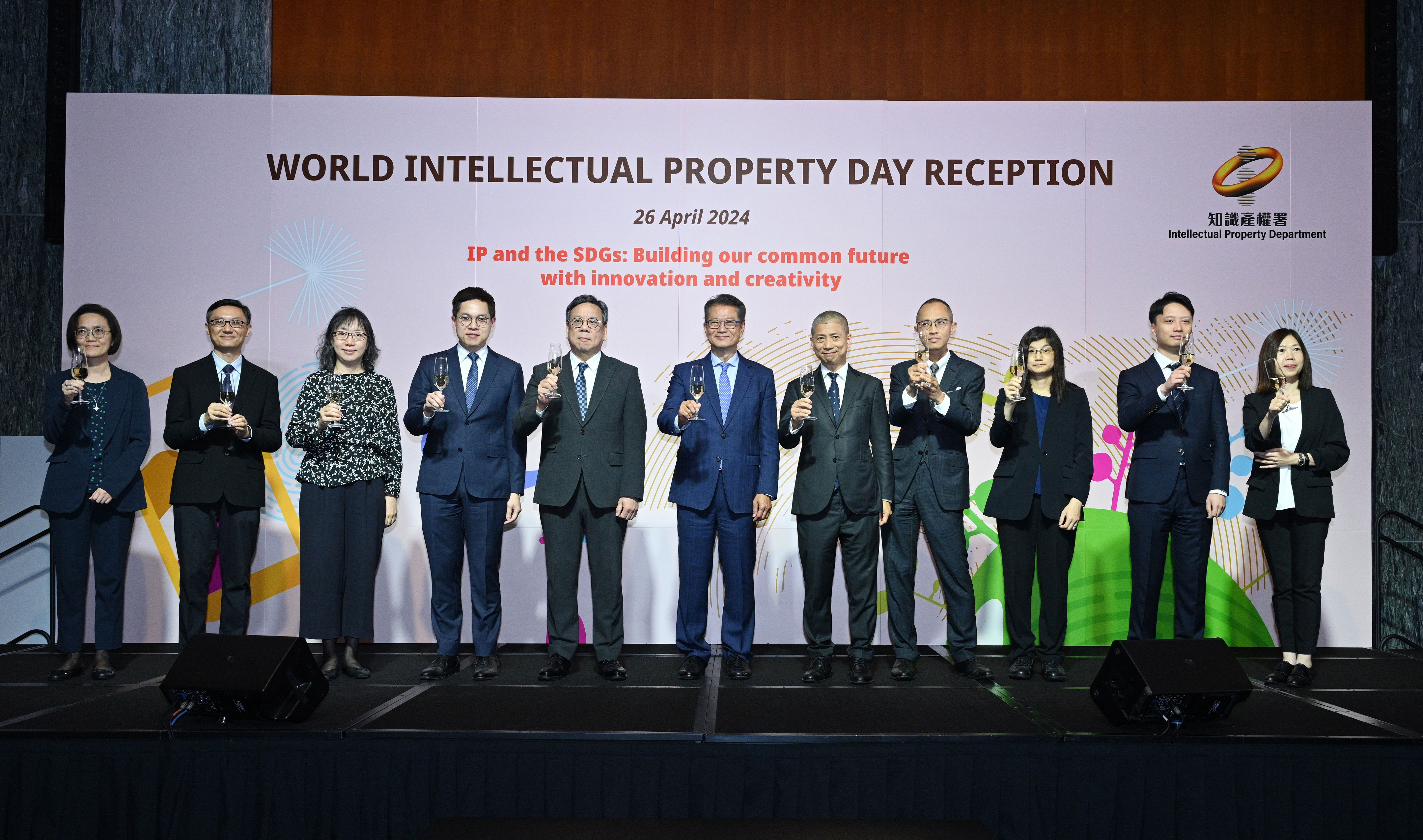 知識產權署今日(4月26日)舉行酒會,慶祝世界知識產權日2024。財政司司長陳茂波和商務及經濟發展局局長丘應樺出席,並主持祝酒儀式。