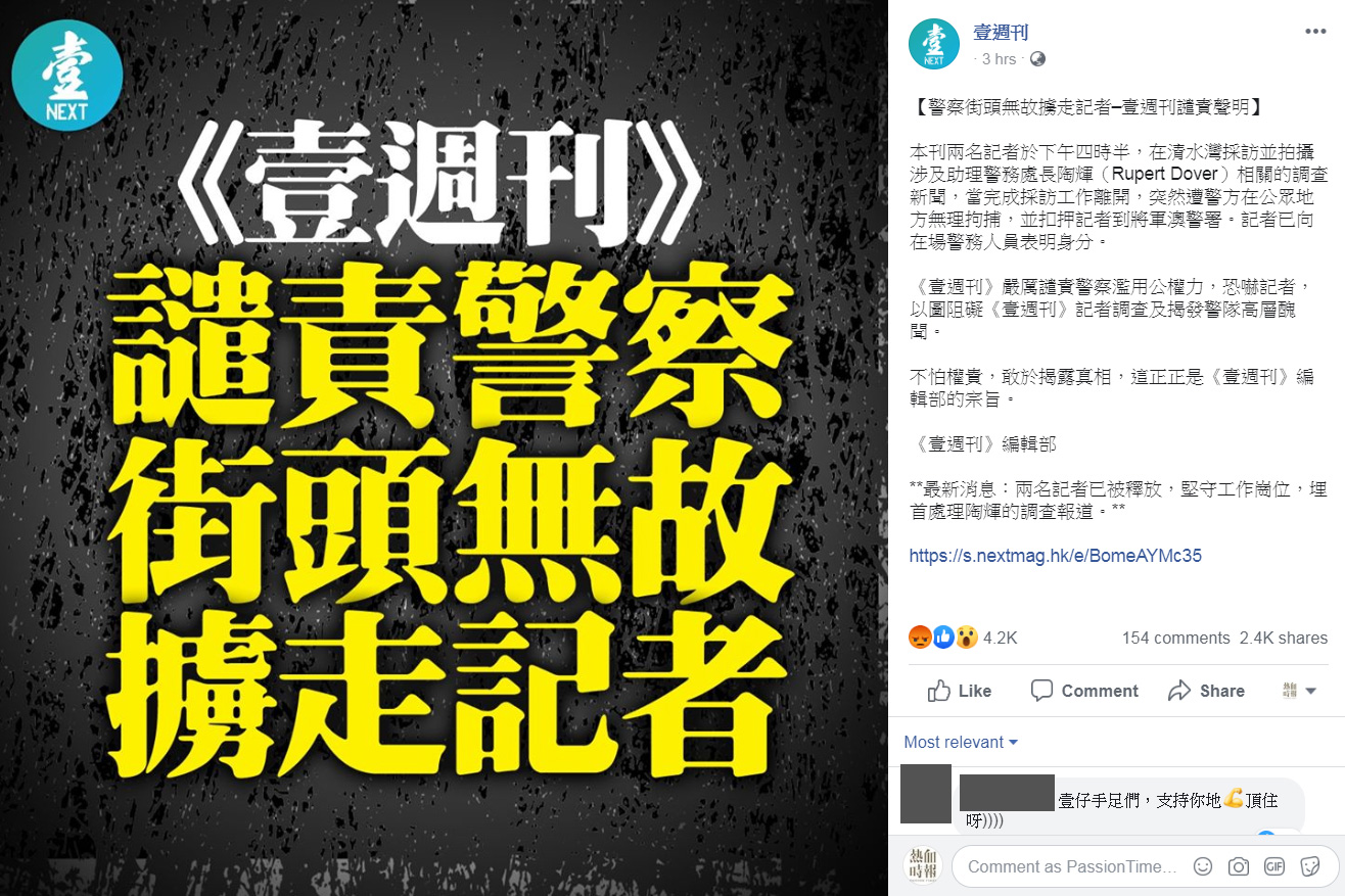 《壹週刊》今晚(4月28日)發聲明,指「警察街頭無故擄走記者」,提到該刊兩名記者於下午4時半,在清水灣採訪並拍攝涉及助理警務處長陶輝(Rupert Dover)相關的調查新聞,當完成採訪工作離開,突然遭警方在公眾地方無理拘捕,並扣押記者到將軍澳警署,記者已向在場警務人員表明身分。