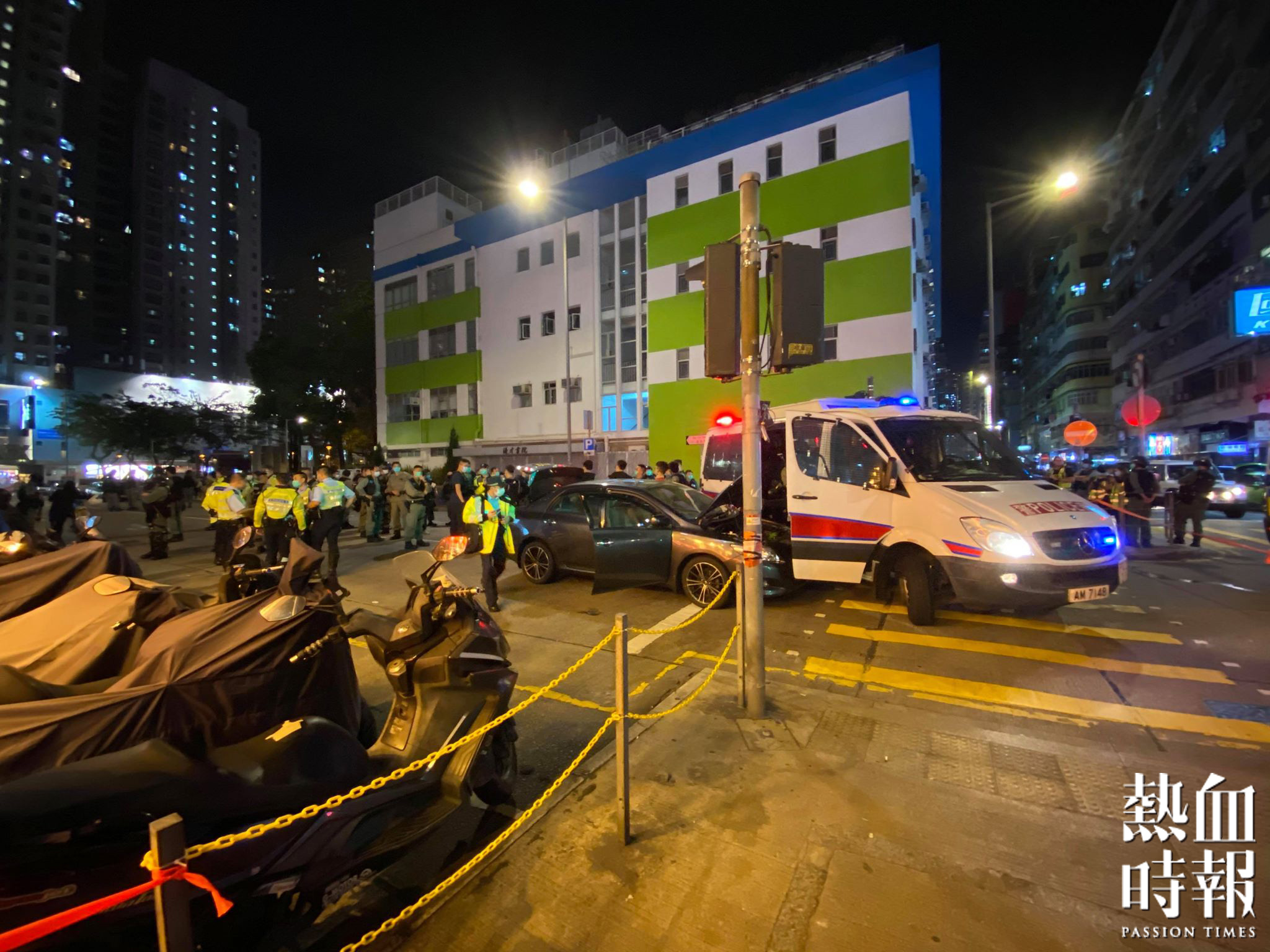 今晚(4月30日)9時許,一輛私家車在旺角山東街及洗衣街交界,亦即優才書院對出與一輛警方衝鋒車有碰撞。