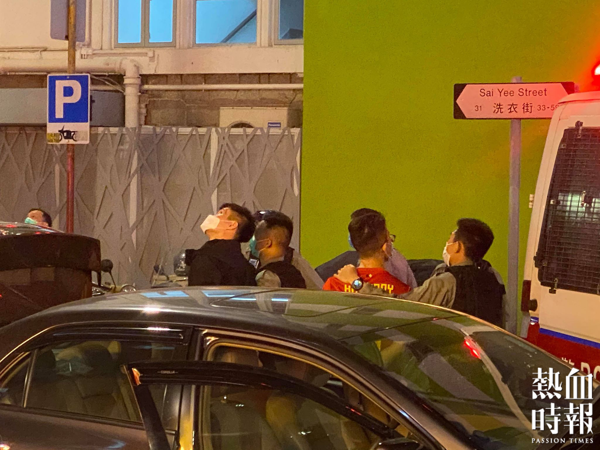 現場一名身穿紅色波衫男子雙手被索上索帶,私家車被搜查,在場有數十名警員在戒備。