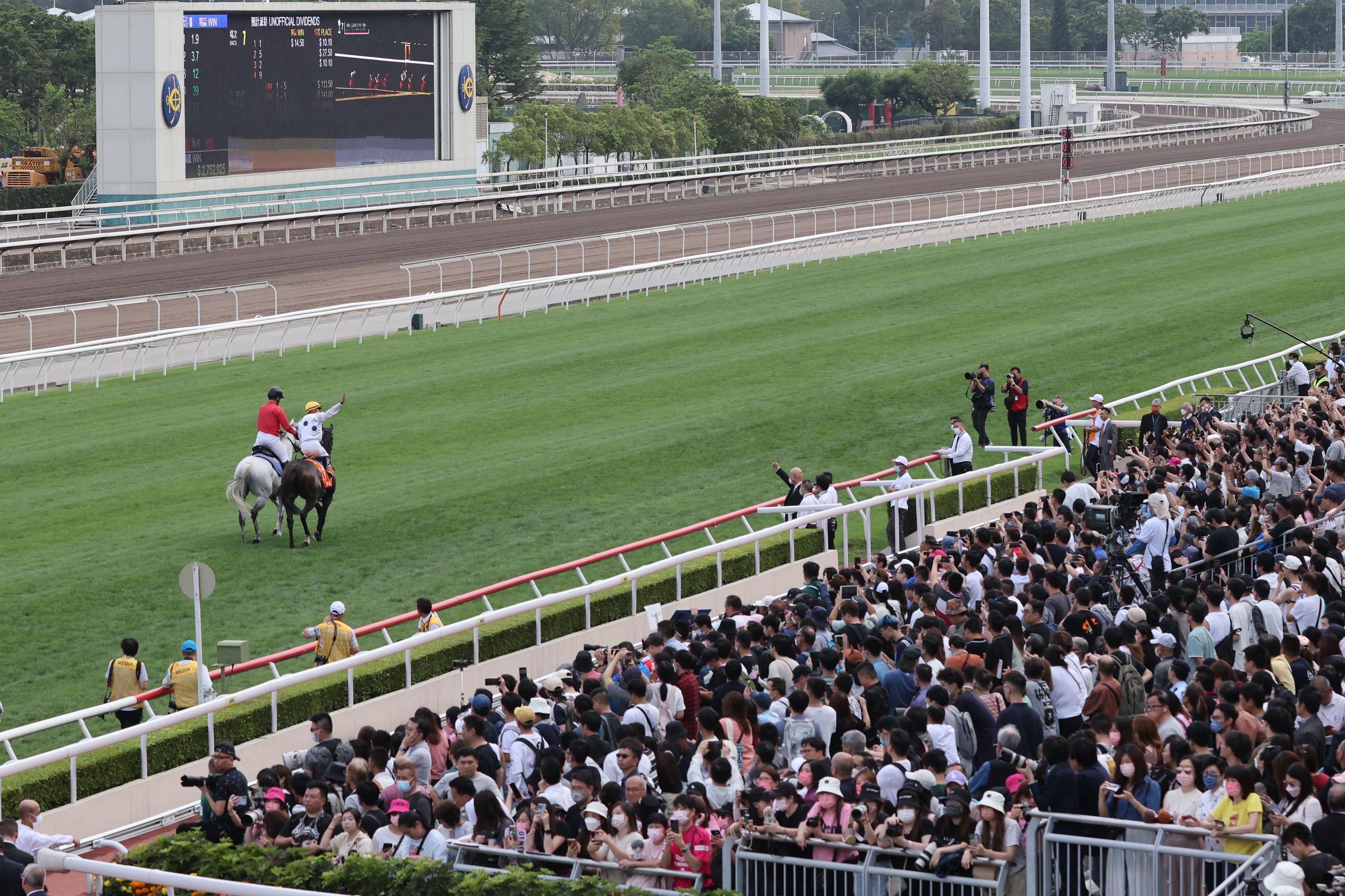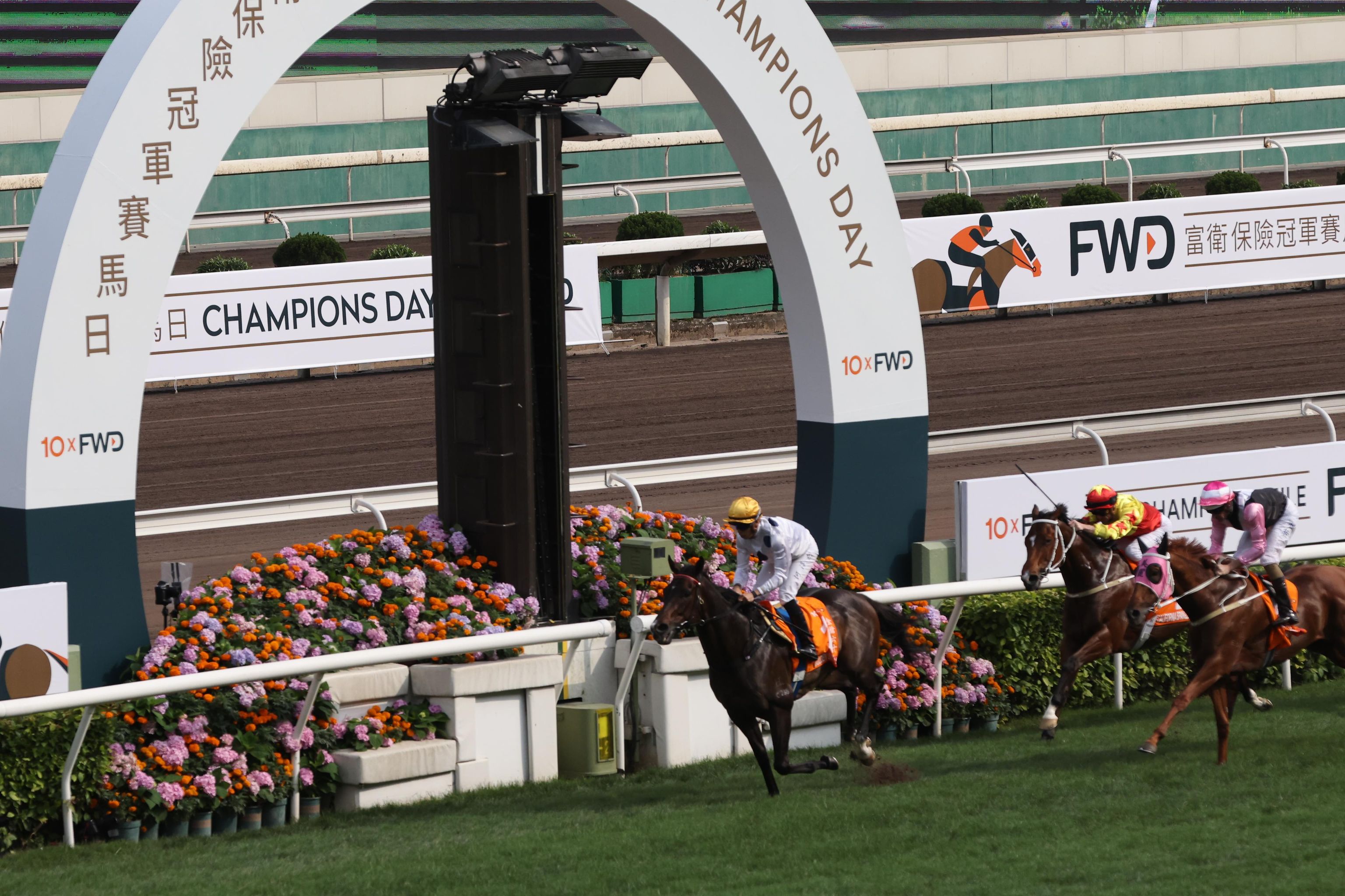 沙田馬場冠軍賽馬日上演三場國際一級賽,其中1600米的冠軍一哩賽,由呂健威訓練的7歲香港馬王「金鎗六十」完成三連霸。