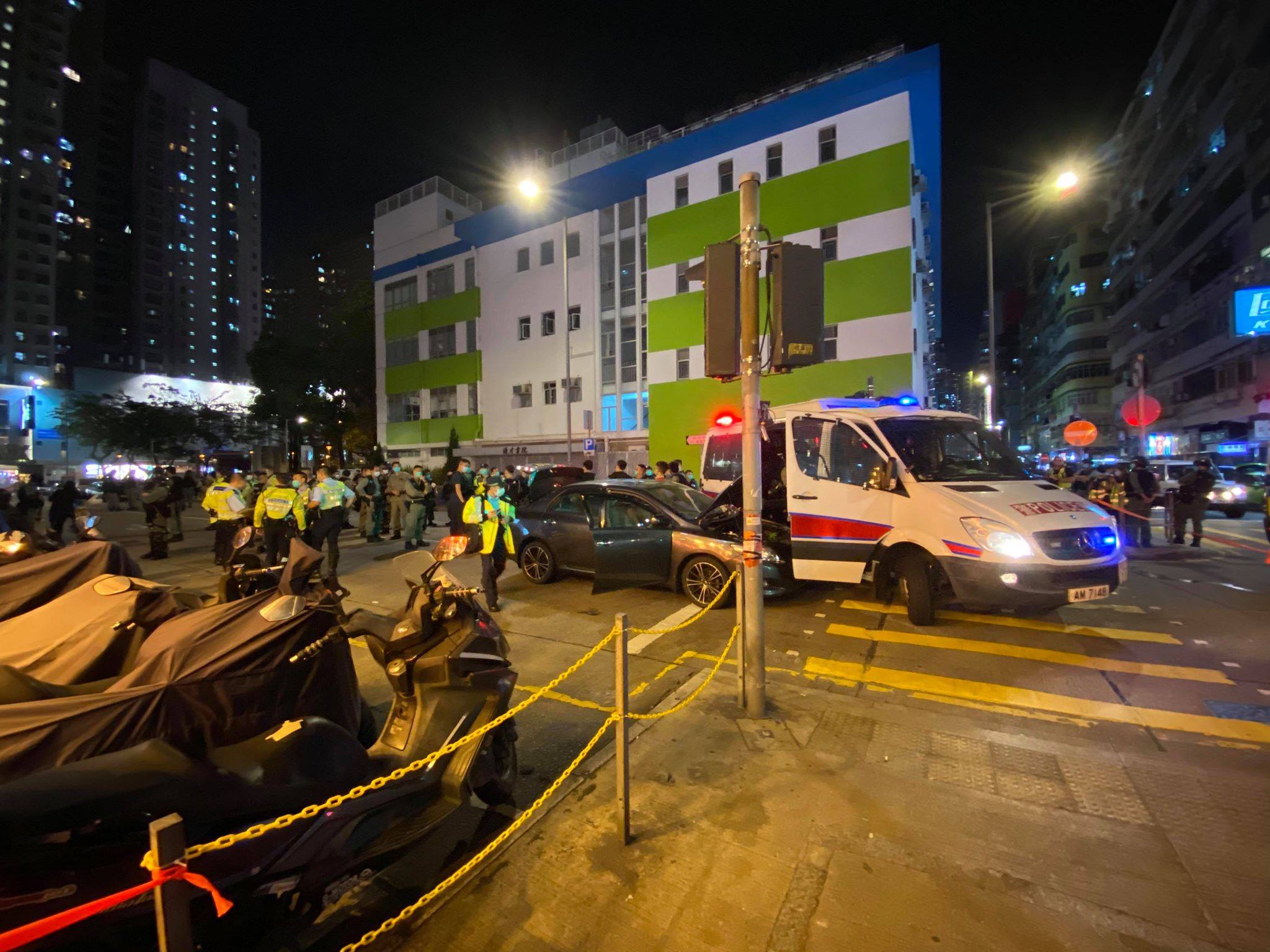 周四(4月30日)晚上9時許,旺角洗衣街及山東街交界,近優才書院有私家車撞向警車事件。