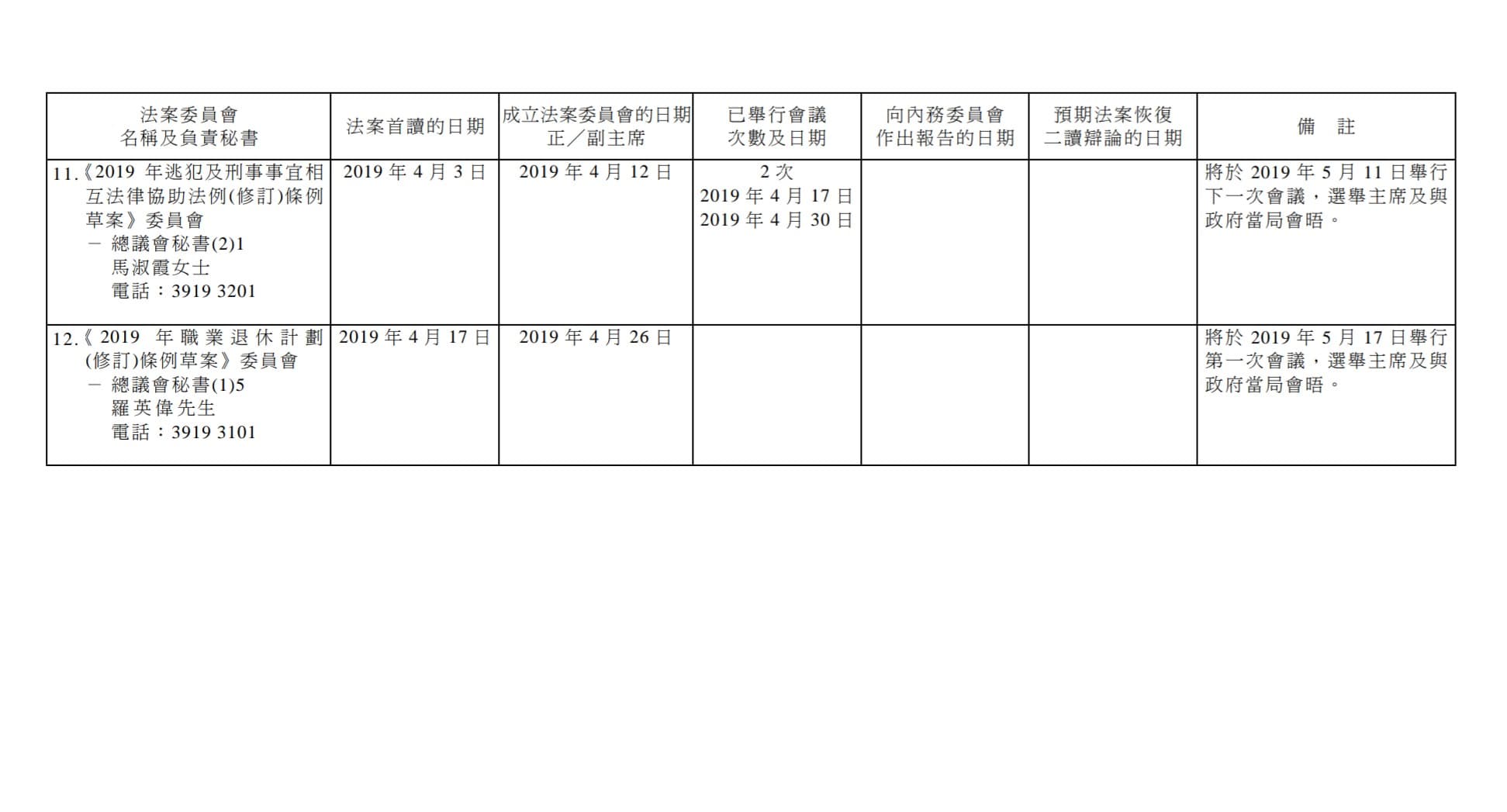 立法會議員石禮謙周一接獲立法會秘書處通知,指《逃犯條例》法案委員的書面投票結果顯示,有36票贊成由他主持該法案委員會,反對則24票,他取消原定於當日今午舉行的會議,改於明日(5月11日)上午9時舉行。然而,原先主持會議的民主黨涂謹申堅持當日下午開會,並選出正副主席。
