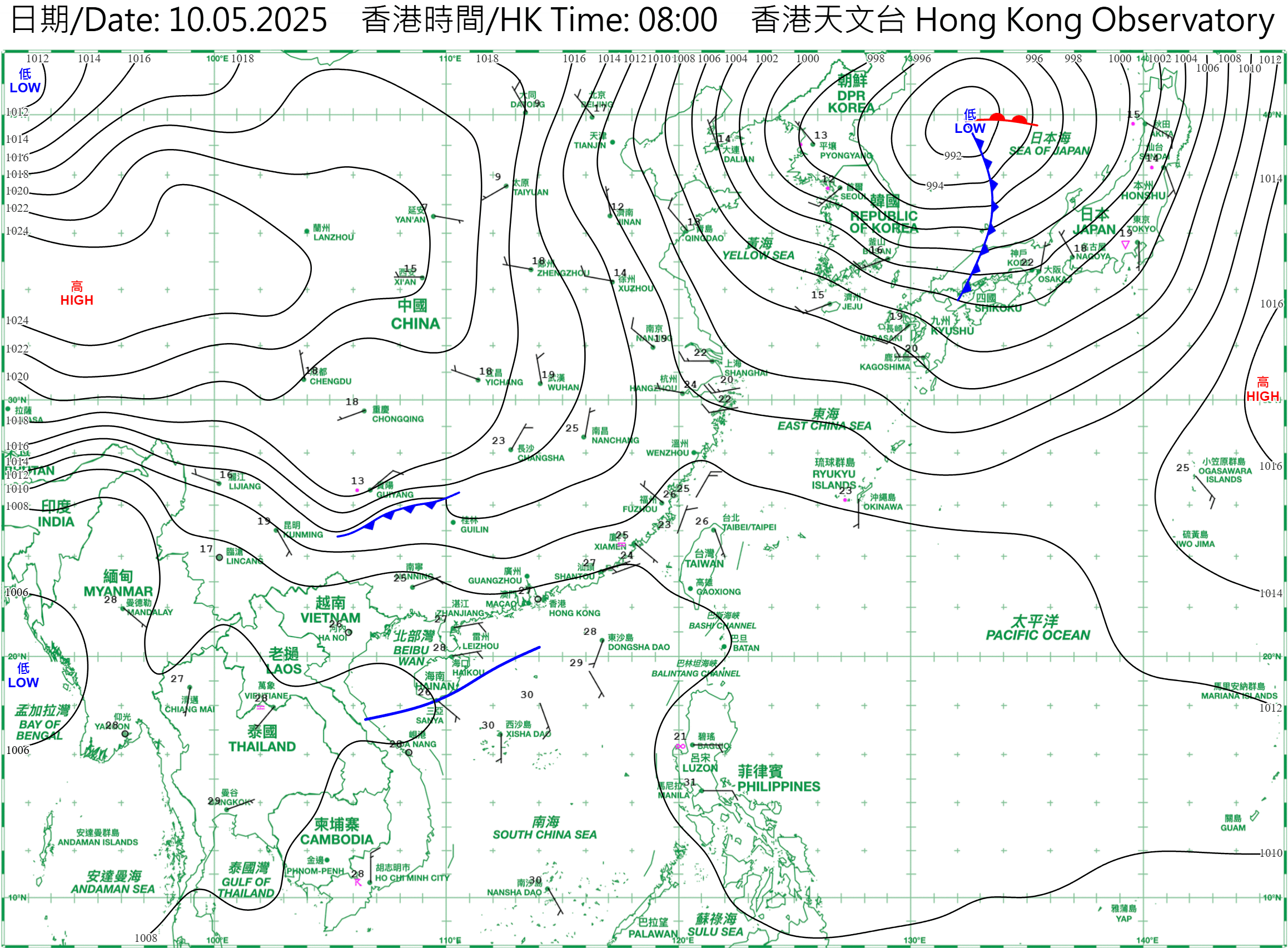 天文台表示,位於華南北部的冷鋒正逐漸向南移動,預料會在今晚橫過沿岸地區。同時,雷雨正影響南海北部及廣東沿岸。