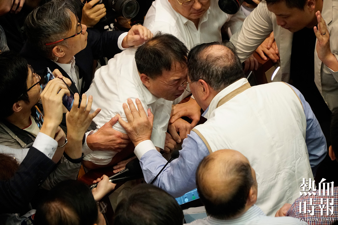 石禮謙獲建制派議員護送下進場,情況極度混亂,最終建制