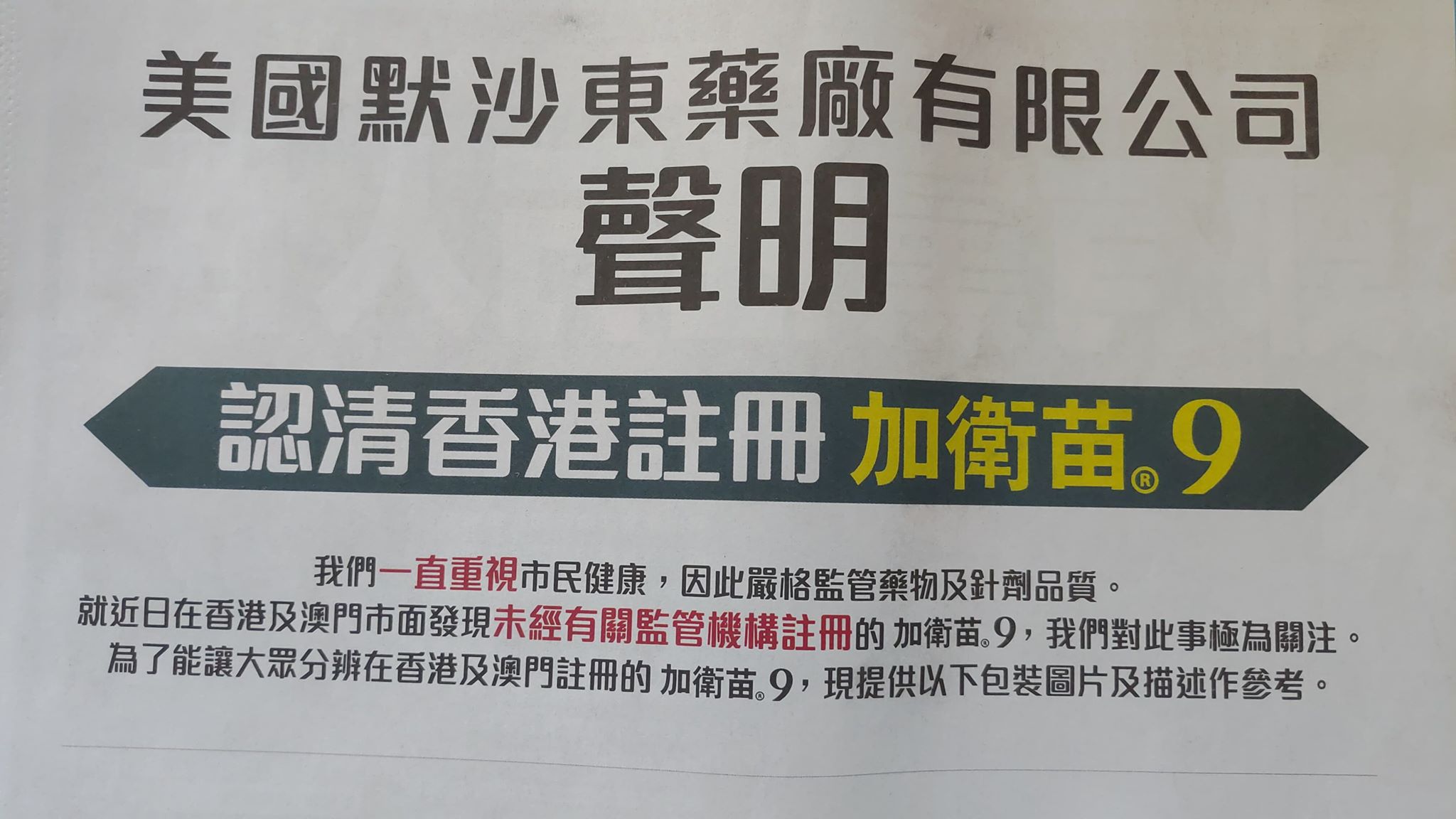 環亞體檢集團被指提供不明來歷的子宮頸癌HPV九價疫苗,疫苗生產商默沙東藥廠日前發聲明,指從未供應有關疫苗予涉事診所,