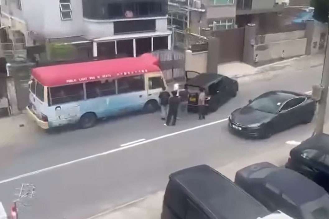 片段顯示,該輛紅色小巴在大棠路近水蕉新村路往大棠方向,被一輛私家車截停,小巴司機之後車前倒後,撞向私家車及持械男子。