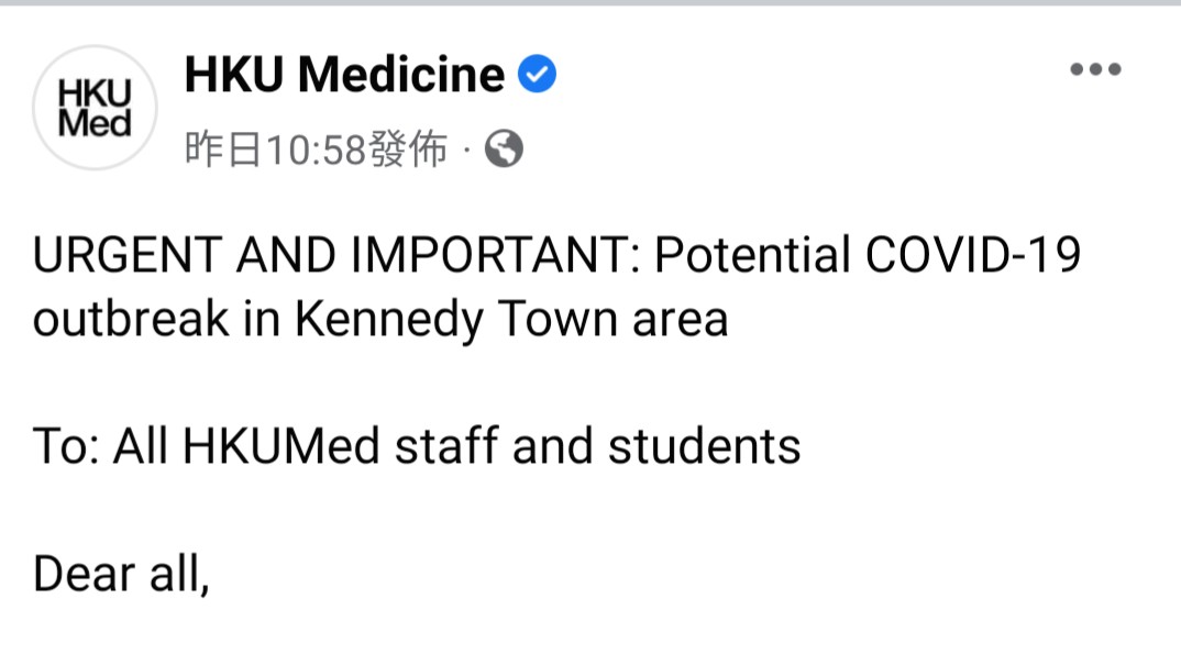 港大醫學院在官方Facebook發帖,指堅尼地城及鄰近地方有機會出現大型新冠感染群組,強烈呼籲教職員和學生本周內勿到當區...