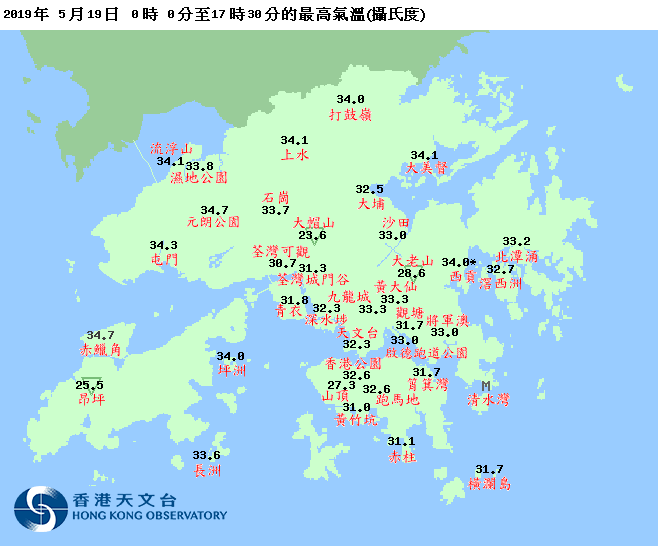 天文台表示,一股西南氣流正影響華南沿岸,本港下午大部分地區氣溫上升至33度左右,打鼓嶺、上水、流浮山、元朗公園、大美督、屯門、西貢、赤鱲角及坪洲都錄得34度以或上高溫。