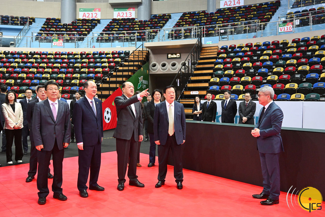 在澳門東亞運動會體育館,夏寶龍參觀了館內的運動場地及會展設施,沿途聽取體育局局長潘永權介紹不同的場館功能、日常使用狀況,以及作為第十五屆全國運動會澳門賽區場地的籌備工作。