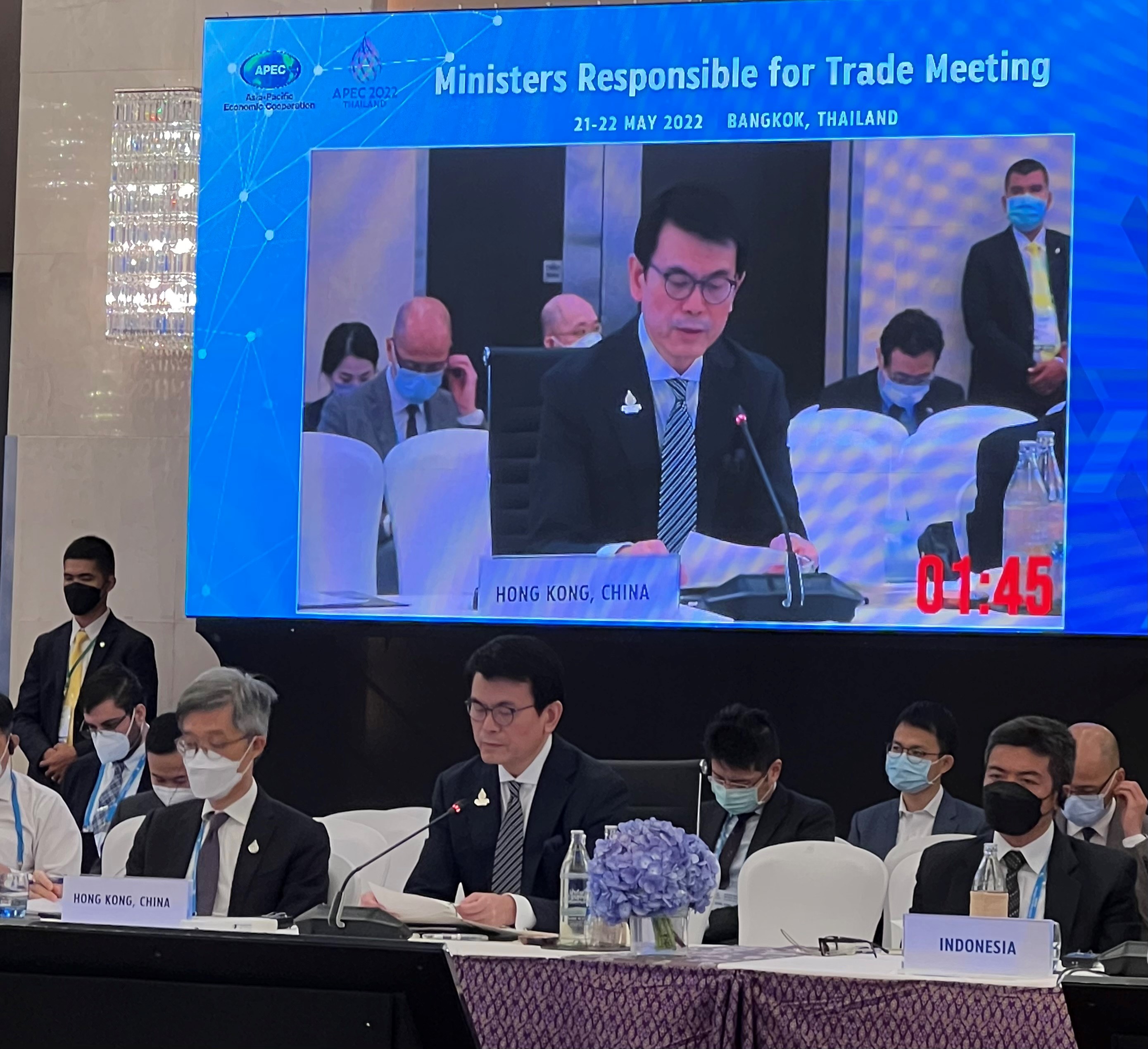 商務及經濟發展局局長邱騰華今日(5月22日)繼續出席在泰國曼谷舉行的亞太區經濟合作組織貿易部長會議,在主題為「在疫下生活及疫後時代」的討論環節上,強調國際合作和區域經濟融合對疫後經濟復蘇的重要性。