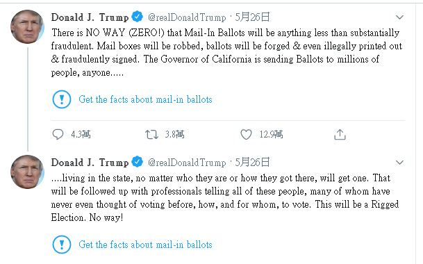 特朗普於5月26日晚發文稱,郵寄投票可能造成「嚴重欺詐」、導致「大選被操縱」,但該貼文卻首度顯示藍色標籤,提醒受眾提醒受眾「請查詢有關郵寄選票的事實」,並有連結至相關新聞報道網頁。
