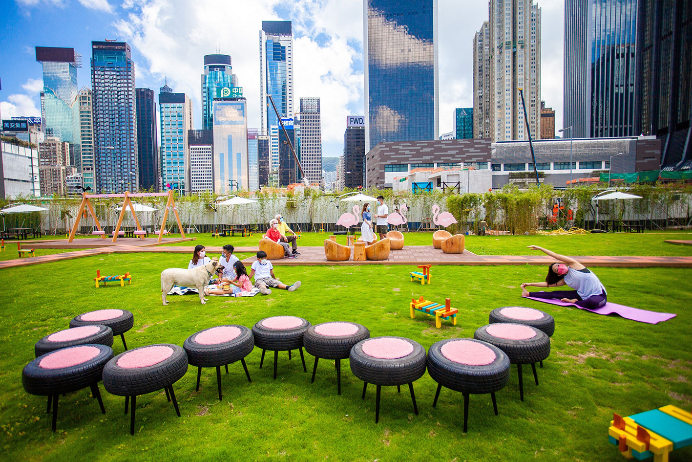 「HarbourChill海濱休閒站」以城市後花園為主題,透過「期間限定」裝置,在草坪上擺放了各式各樣的蔭棚、座椅和鞦韆,色調與鄰近的「粉紅通道」互相呼應。